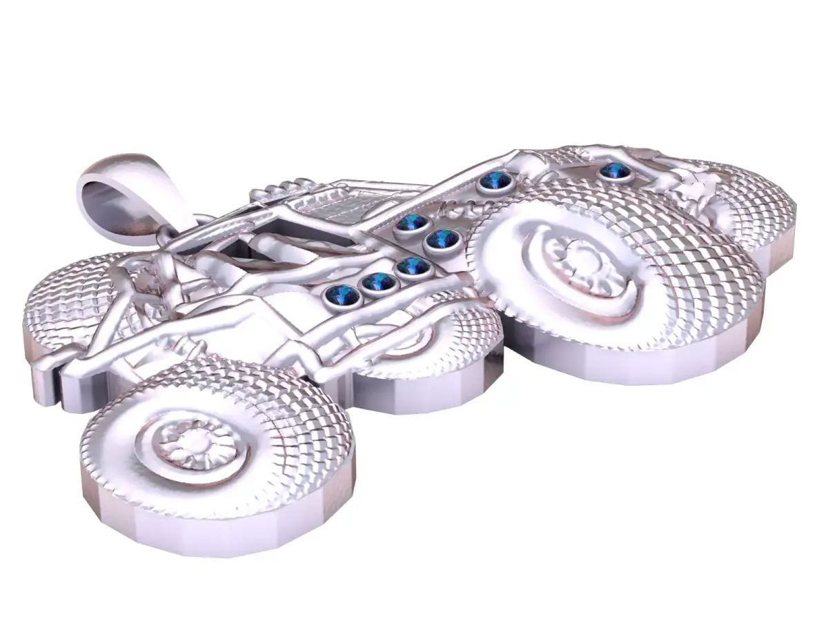 The Golden Off-Road Beast Pendant is a bold tribute to adventure, power, and rugged freedom. Designed with exceptional detail in a high-polish gold finish, this pendant features a fully sculpted 4x4 off-road vehicle complete with oversized treaded tires, reinforced roll cage, and realistic body detailing. Striking purple gemstone accents along the side panels add a touch of luxury and contrast to the aggressive design.Perfect for off-road enthusiasts, motorsport lovers, and collectors of unique statement jewelry, this pendant symbolizes strength, exploration, and unstoppable drive. Whether worn as a personal emblem or showcased as a collectible piece, it delivers a powerful fusion of automotive passion and premium craftsmanship.