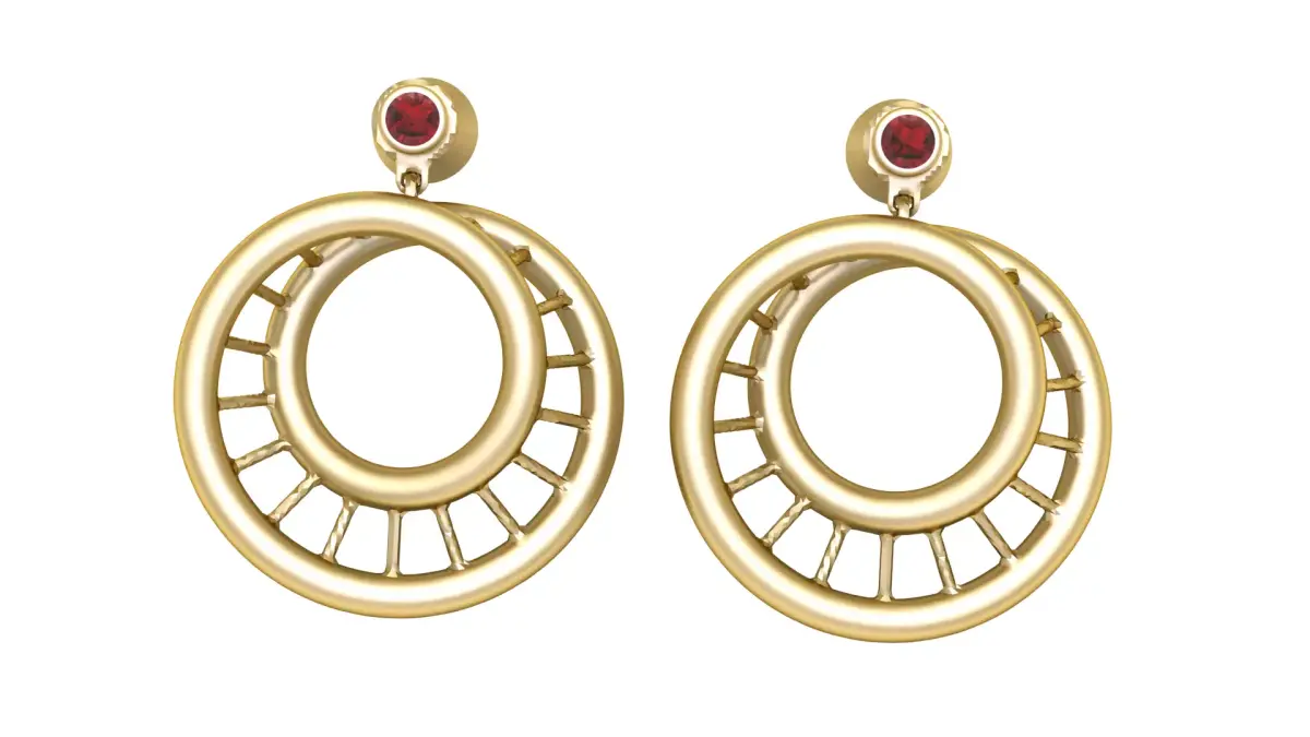 A pair of modern gold earrings designed with dual concentric hoops, connected by radial bars for a structured yet stylish look. Each piece is topped with a vivid red gemstone stud, adding a bold pop of color to the elegant gold finish.