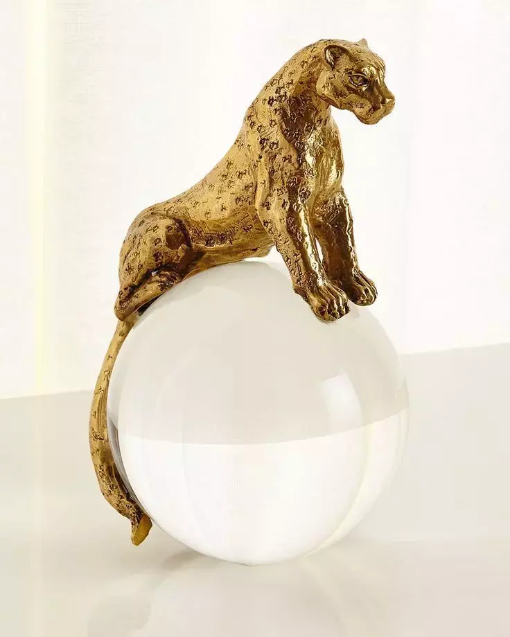 The panther sits in a poised, alert posture—head turned slightly to the side, eyes focused forward, and tail draped gracefully over the edge of the sphere. This dynamic pose suggests readiness and power, while maintaining a sense of calm control. The crystal ball beneath it is made of clear, flawless glass or quartz, with a perfectly smooth, spherical shape that reflects its surroundings and creates subtle refractions and distortions. The base of the ball rests on a flat surface, grounding the sculpture in space and emphasizing its balance and stability.