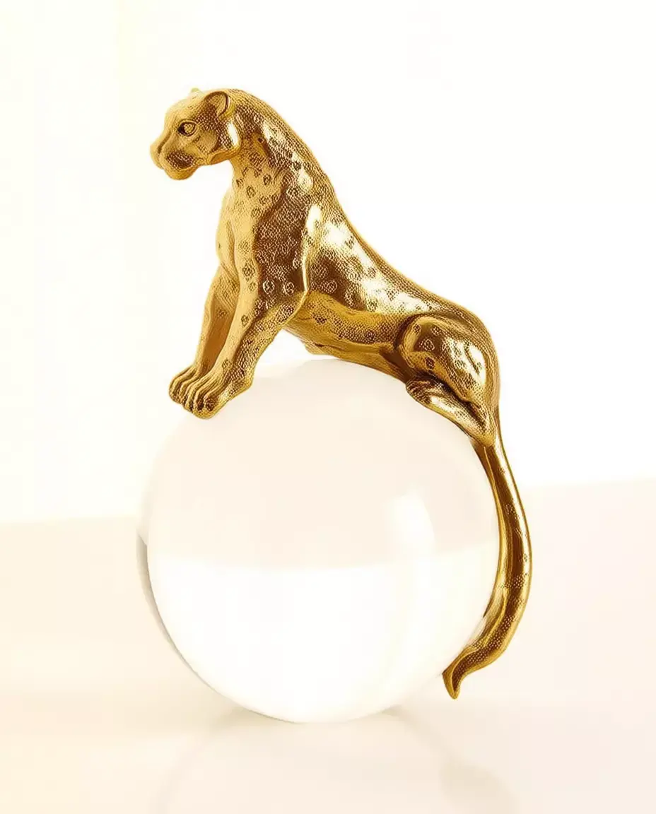 Ultra-realistic 3D model of a golden panther perched atop a crystal ball, designed as a luxurious and symbolic art piece. The panther is rendered in polished gold or brass with a lustrous, reflective surface that captures light beautifully, enhancing its regal presence. Its form is sleek and stylized, with smooth curves and defined musculature that evoke strength, elegance, and grace. The fur texture is subtly detailed with fine spots and patterns, adding depth and realism to the metallic finish.