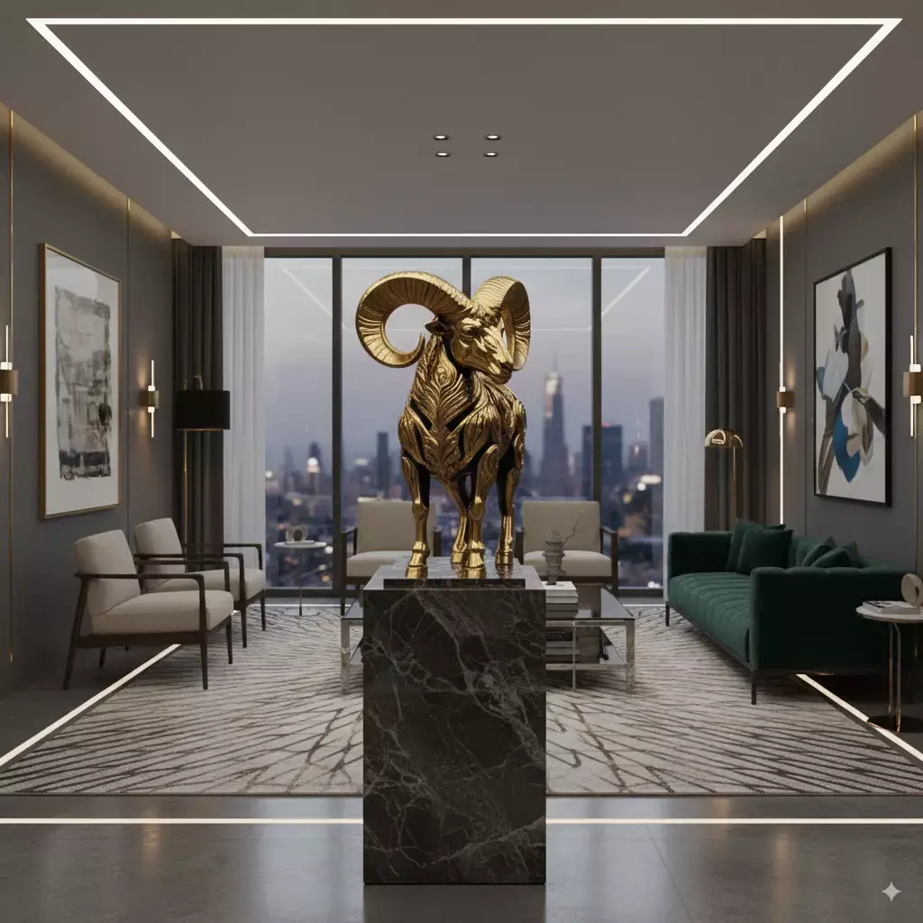 Highly detailed 3D model of a majestic golden ram sculpture, standing proudly atop a rocky outcrop in a breathtaking mountainous landscape. The ram is rendered in polished gold with intricate, flowing ornamental patterns covering its body—featuring swirling motifs, leaf-like designs, and symbolic engravings that evoke ancient craftsmanship and mythological significance. Its massive, spiraling horns are sculpted with fine ridges and elegant curves, reflecting light with a radiant sheen that emphasizes their grandeur. The animal’s muscular build and poised stance convey strength, nobility, and resilience, while its calm yet alert expression adds a sense of divine presence.