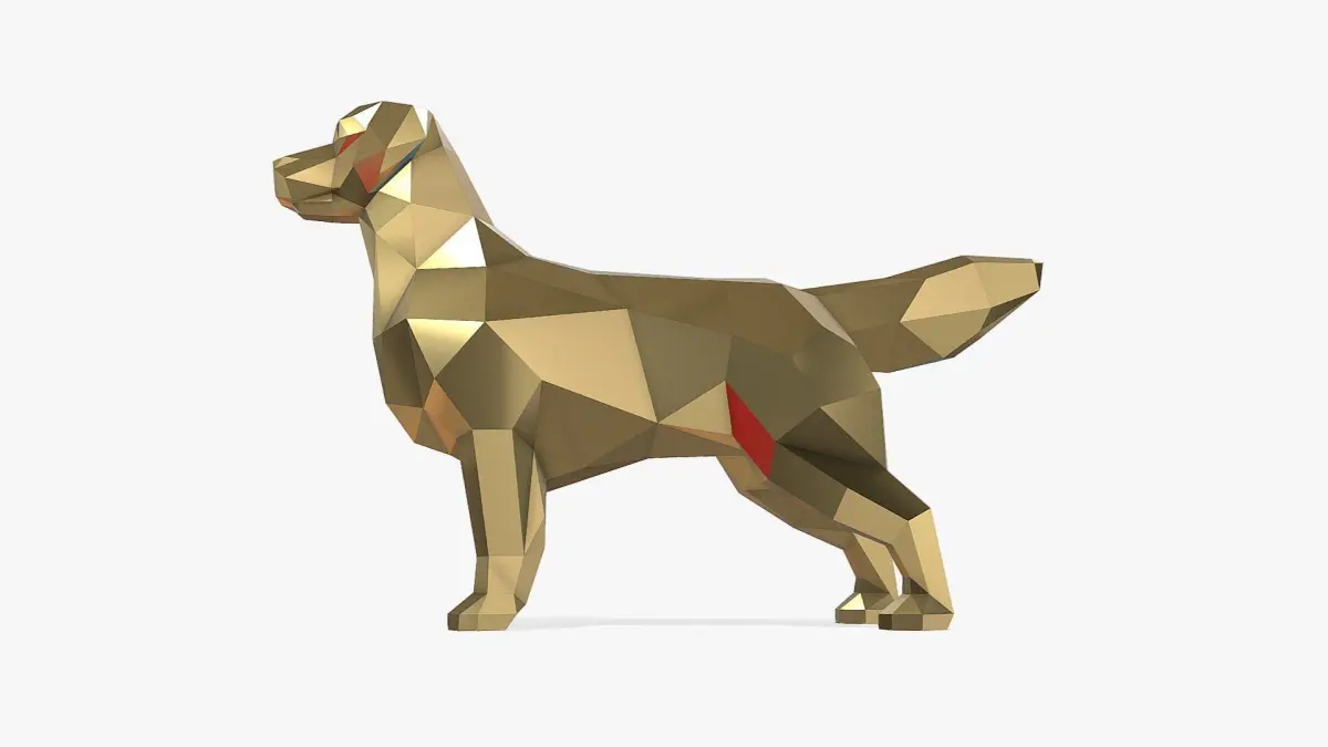 Low poly model, created for 3D printing. You can also use it as a base model for your projects.This model can be used as a decoration in your interior.3D design of a Golden Retriever could feature a realistic and detailed portrayal of the dog, capturing its friendly and alert expression. The coat could be textured to showcase the golden fur in all its varying shades, with intricate details like wispy hair around the ears and feathering on the tail. The eyes could be bright and sparkling, conveying the breed’s intelligent and kind nature. The pose could depict the dog in a playful stance, with a wagging tail and a joyful expression, capturing the essence of this beloved breed.