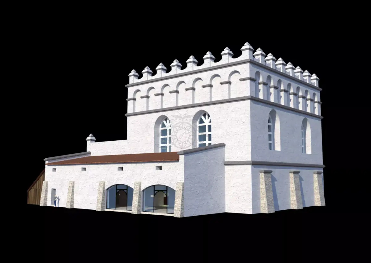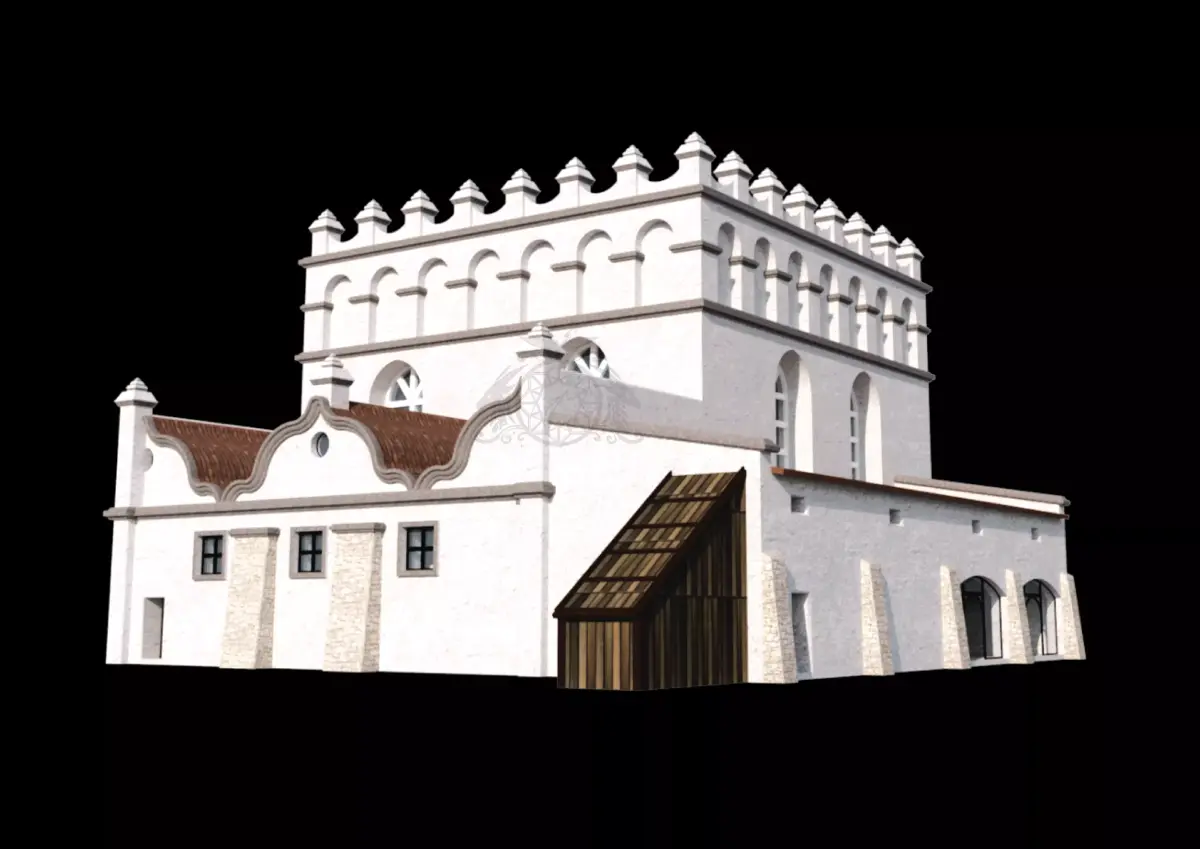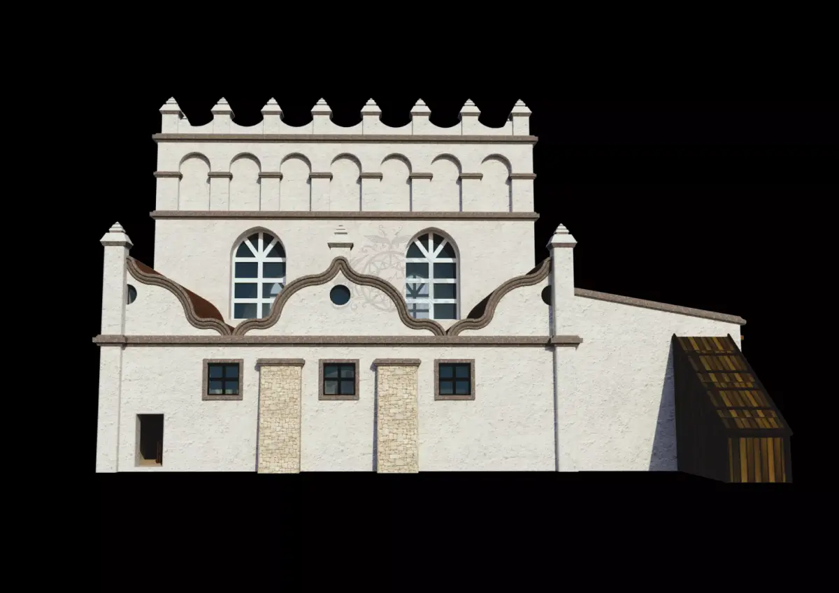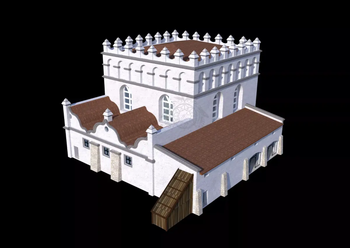 This 3D model represents a possible real-life reconstruction of a historic Orthodox Jewish synagogue, the 16th-century Golden Rose/Turei Zahav Synagogue of Lviv (Ukraine). It's commonly characterized by solid masonry walls, arched windows, pointed vaults, and a fortress-looking upper volume adorned with merlon-embrasure features. The exterior showcases white plastered thick stone walls and ornamental roofline details.