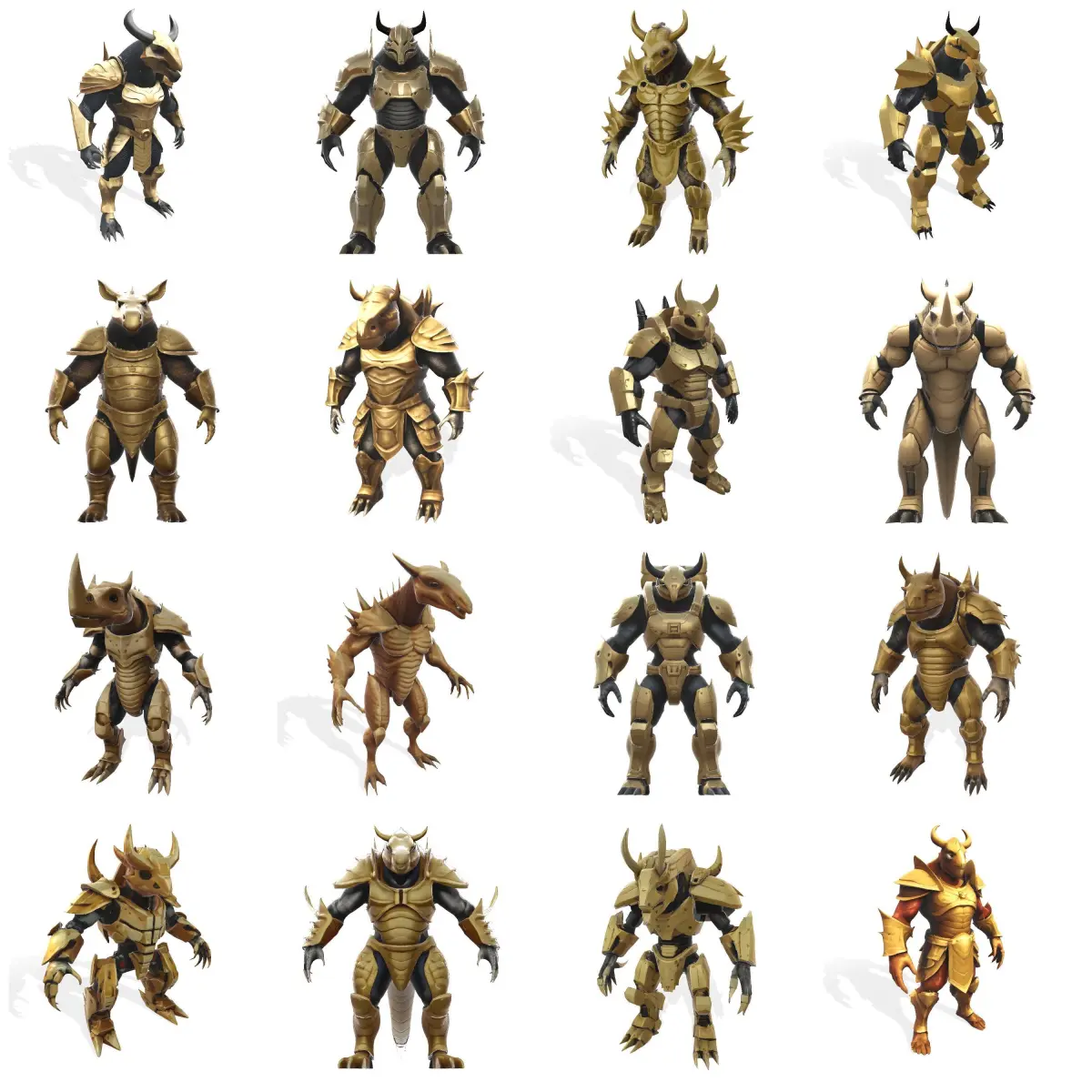 Unleash the power of the Golden Sentinel Armor Collection – a stunning series of 16 meticulously crafted warrior models ready to elevate your game development, animation projects, or tabletop gaming experiences! Each character features a magnificent gold-dominant armor design with sleek black accents and unique animal-inspired helmets including dragon, rhino, and bull variations.