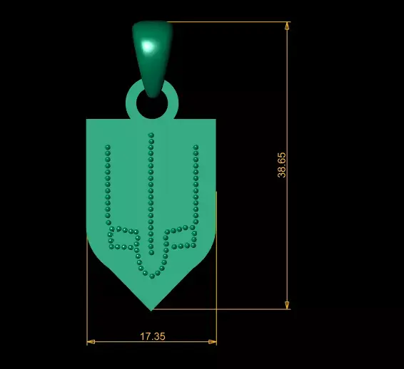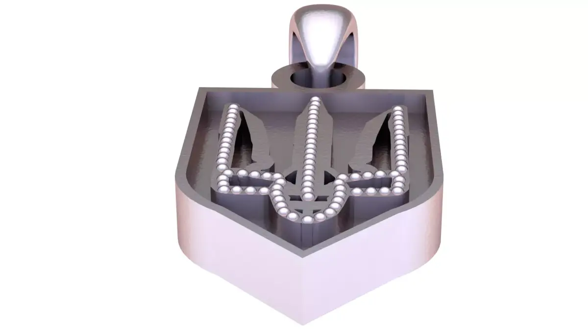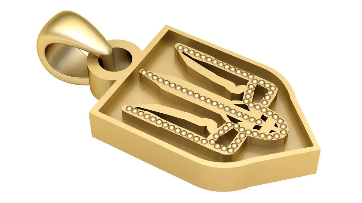 This bold pendant features a raised trident emblem set within a shield-shaped frame, crafted in radiant gold. The trident outline is highlighted with a series of delicate bead-like accents, adding texture and detail while enhancing its symbolic strength. With its powerful shape and elegant finish, this pendant makes a striking statement of courage and authority.