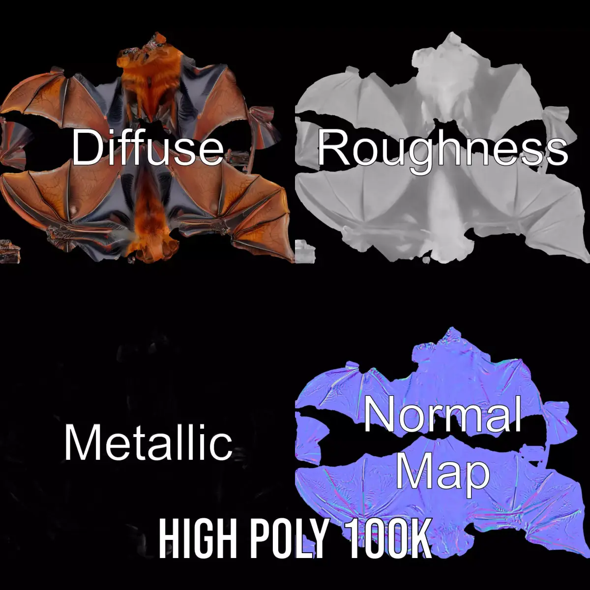 Discover the intricate details of the Golden Winged Bat model pack, designed to bring realism and detail to your projects. This 3D model features highly detailed bat anatomy with lifelike wing textures, perfect for nature documentaries, virtual reality experiences, or game development. Each model has 3 levels of detail: low-poly (1000 triangles for mobile), middle-poly (10,000 triangles for environment), and high-poly (100,000 triangles), which allows for the use of this model in production rendering (such as 3ds Max, Maya, Cinema4D, Blender, Vray/Corona/Cycles, and all other platforms), game engines (Unity and Unreal compatible), and interactive presentations, providing a choice of detail based on the LOD System principle. The model's textures are PBR, Diffuse, NormalMap, and reflection/roughness/metallic, which are suitable for any modern rendering engine. All models are accurately unwrapped and have no overlapping UVs. All textures are 4096*4096 in size. Please like and leave a comment if you enjoyed this model.