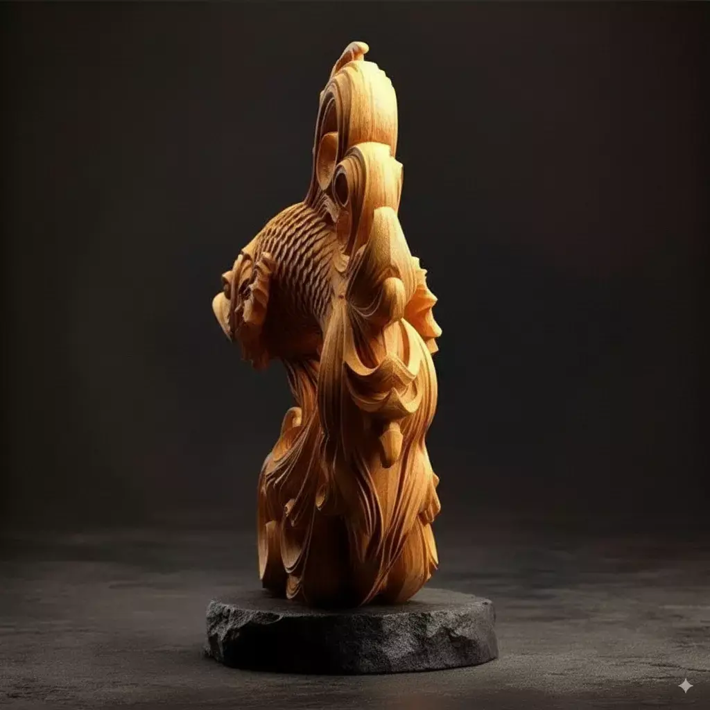 The sculpture rests on a dark, rough-hewn stone base that contrasts beautifully with the smooth, polished finish of the wood, grounding the piece in nature while elevating its artistic presence. The warm golden tones of the wood are enhanced by soft lighting, highlighting the depth of the carvings and the fine craftsmanship. This piece embodies the spirit of Japanese and Chinese artistic traditions, where koi represent perseverance, good fortune, and transformation—making it ideal for use in interior design, spiritual spaces, garden décor, or as a cultural symbol in digital storytelling.