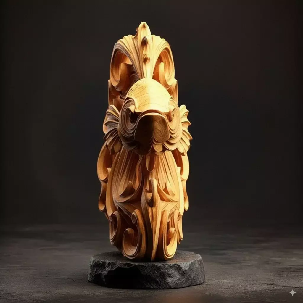 Exquisite 3D model of a highly detailed, ornate koi fish sculpture crafted in rich golden wood, blending traditional Eastern artistry with surreal, flowing design. The fish is depicted in mid-swim, its body elegantly curved and adorned with intricate scales that shimmer with natural wood grain textures. The most striking feature is its dramatically stylized tail and fins, which transform into swirling, wave-like patterns resembling calligraphy or clouds—symbolizing movement, harmony, and the flow of water in Feng Shui philosophy. These dynamic flourishes create a sense of motion and grace, as if the fish is gliding through an invisible current.
