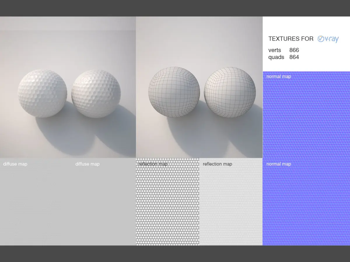 you get 2 golfballs balls with PBR flattened textures for VRay Standard Material (VRayMtl) for 3ds max and maya.