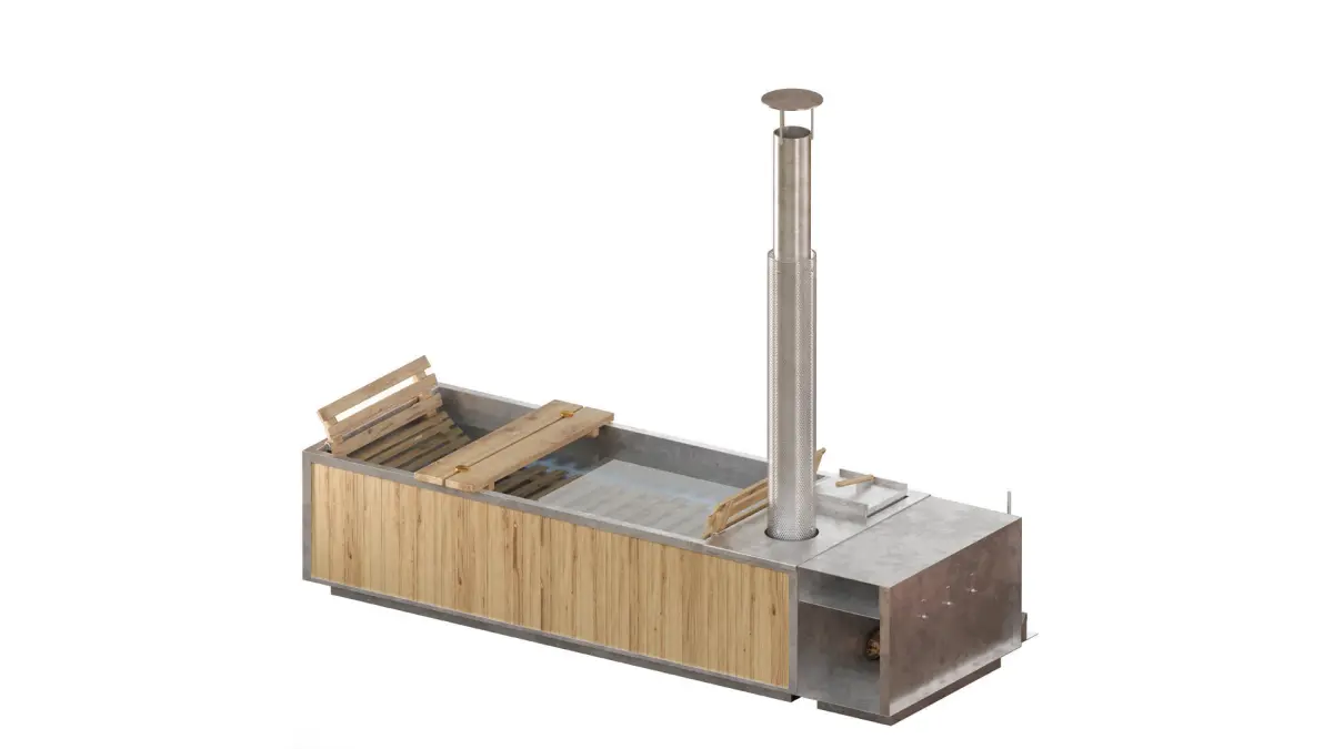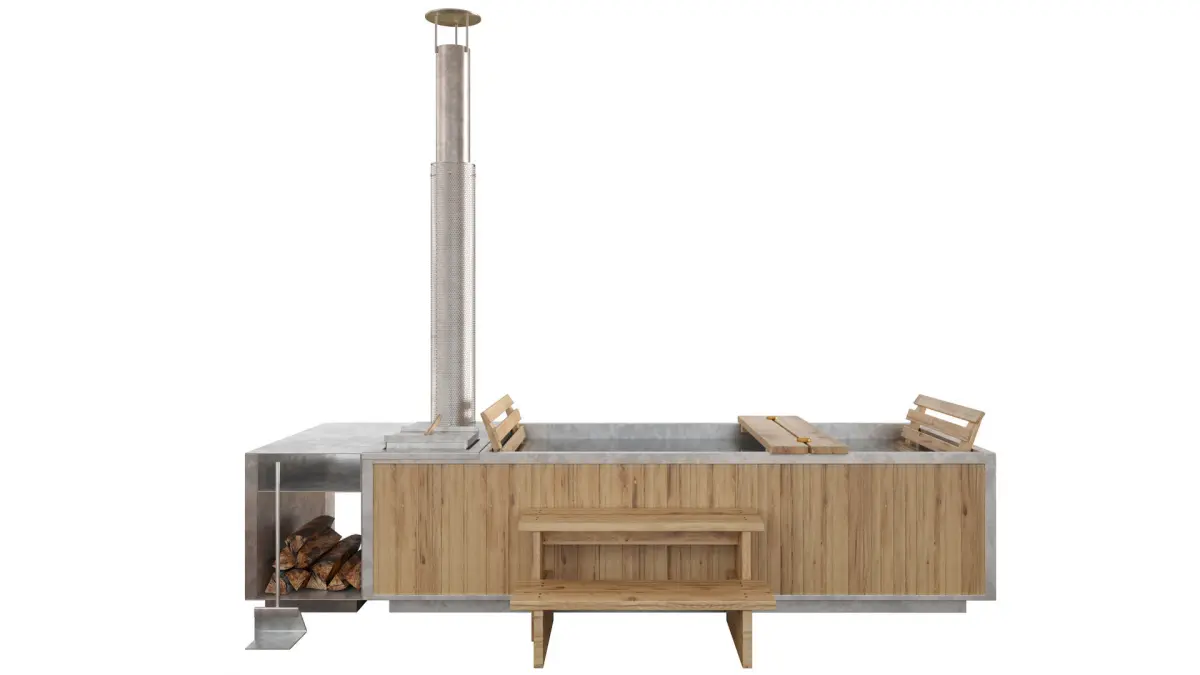 Goodland Wood Burning Tube 2320x940x250mmFirewood Holder 430x940x608mmCedar Bath Tray 280x60x990mmCedar Steps 840x480x410mmAluminum Ash Scoop 640mm