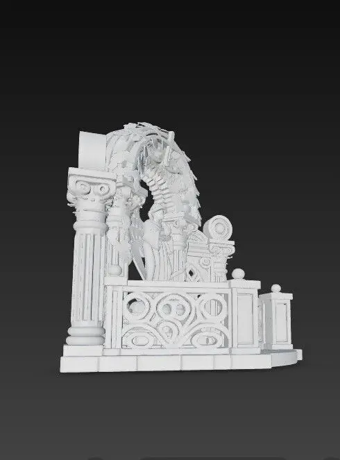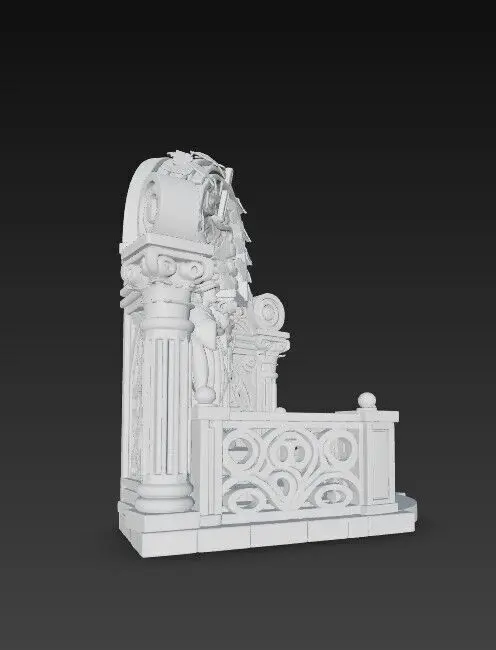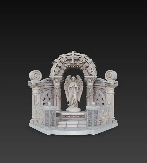 The model appears as though printed from a single-color, matte gray filament, evoking the impression of a freshly printed prototype or miniature sculpture. Every detail—from the facial features and wings of the angel to the railings’ intricate patterns and the arch’s foliage—is meticulously optimized for high-quality 3D printing. This piece is a perfect choice for fantasy dioramas, desktop decorations, religious shrines, or model collections.