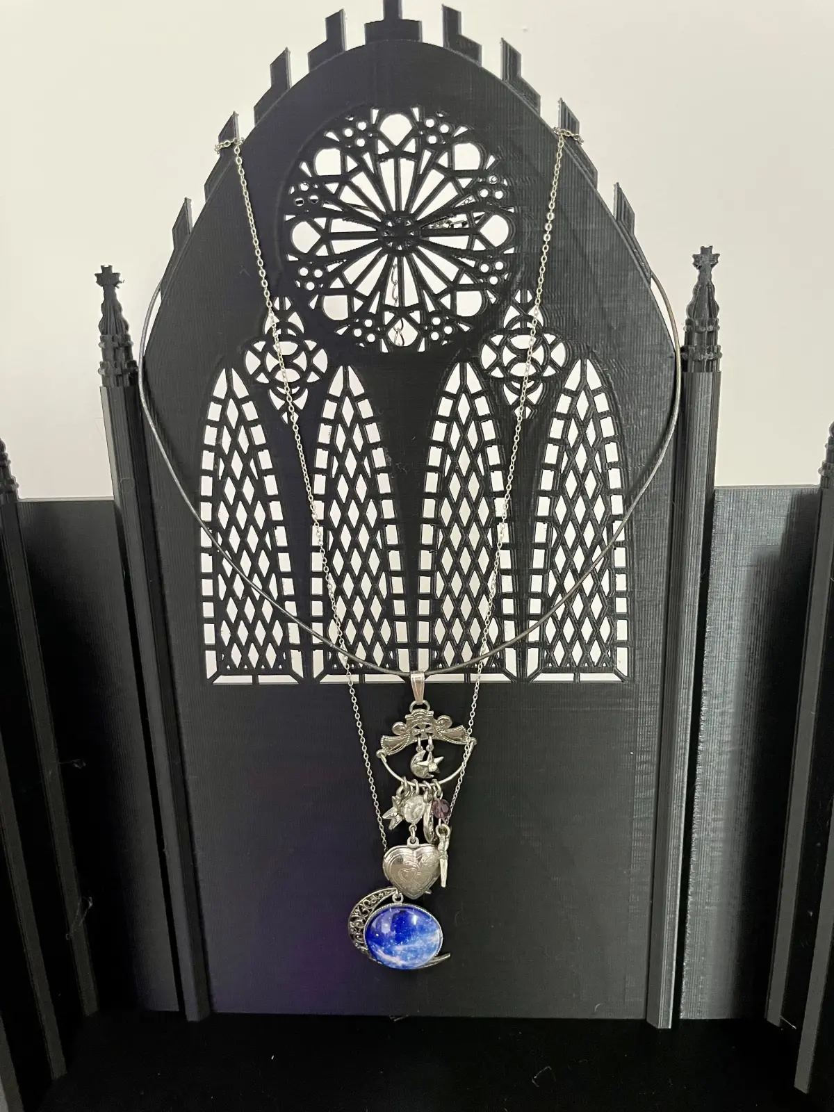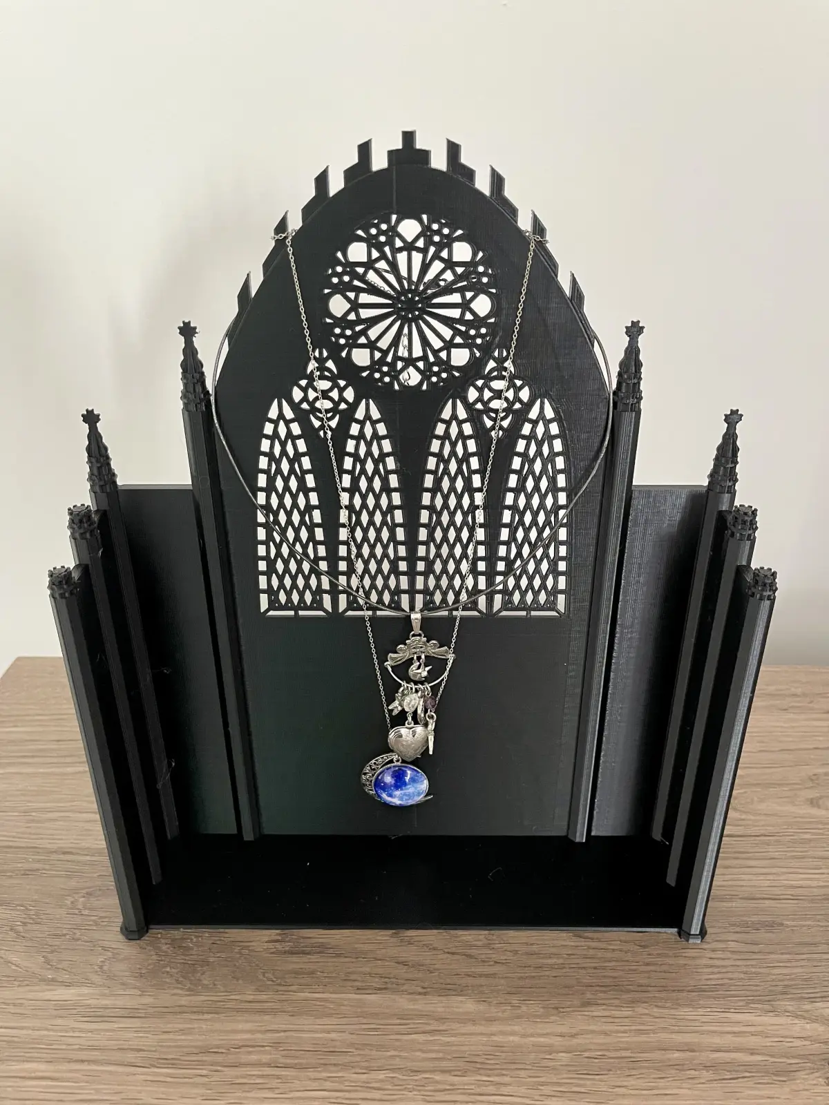 This is a necklace display perfect for craft show booths! Beautifully detailed on the back to catch the eye, plain enough on the front to not draw attention from the jewelry. Prongs at the top allow for wrapping chains to get your pieces sitting just right. Get creative and throw some rings on the spires or earrings in the stained glass lattice!