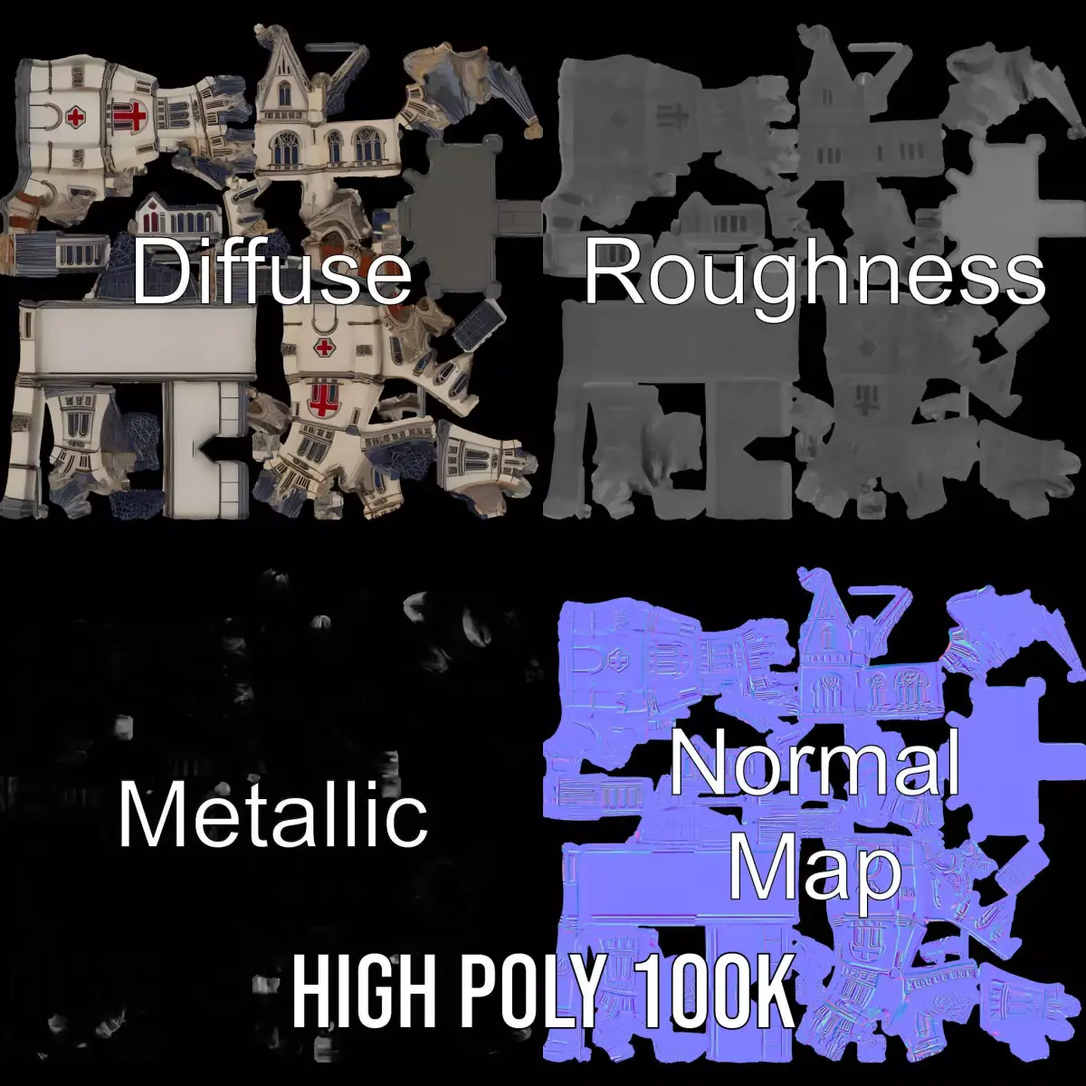 This Gothic Cathedral Stone model pack features an intricately designed cathedral with exquisite gothic architecture. Each model has 3 levels of detail: low-poly (1000 triangles for mobile), middle-poly (10,000 triangles for environment), and high-poly (100,000 triangles), which allows for the use of this model in production rendering (such as 3ds Max, Maya, Cinema4D, Blender, Vray/Corona/Cycles and all others), game engines (Unity and Unreal compatible), and interactive presentations, providing a choice of detail based on the LOD System principle. Ideal for historical reconstructions, architectural visualizations, and virtual reality experiences. The model's textures are PBR, Diffuse, NormalMap, and reflection/roughness/metallic, suitable for any modern rendering engine. All models are accurately unwrapped with no overlapping UV. All textures are 4096*4096 in size. Please like and leave a comment if you enjoyed this model.