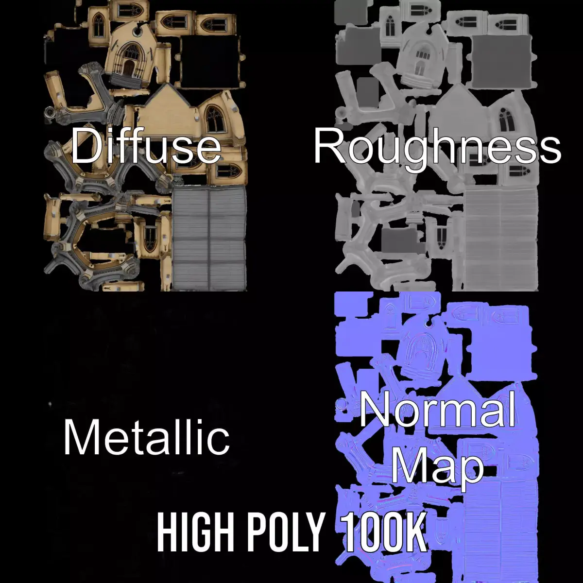 The Gothic Chapel Stone model features exquisite detailing with a classic architectural design. Perfectly suited for historical visualizations, game environments, and virtual tours, its timeless style adds depth to any scene. Each model has 3 levels of detail: low-poly (1000 triangles for mobile), middle-poly (10,000 triangles for environment), and high-poly (100,000 triangles), which allows for the use of this model in production rendering (such as 3ds Max, Maya, Cinema4D, Blender, Vray/Corona/Cycles and all others), game engines (Unity and Unreal compatible), and interactive presentations, providing a choice of detail based on the LOD System principle. The model's textures are PBR, Diffuse, NormalMap, and reflection/roughness/metallic, which are suitable for any modern rendering engine. All models accurately unwrapped and have no overlapping UVs. All textures are 4096*4096 in size. If you like this model, please leave a comment and like!