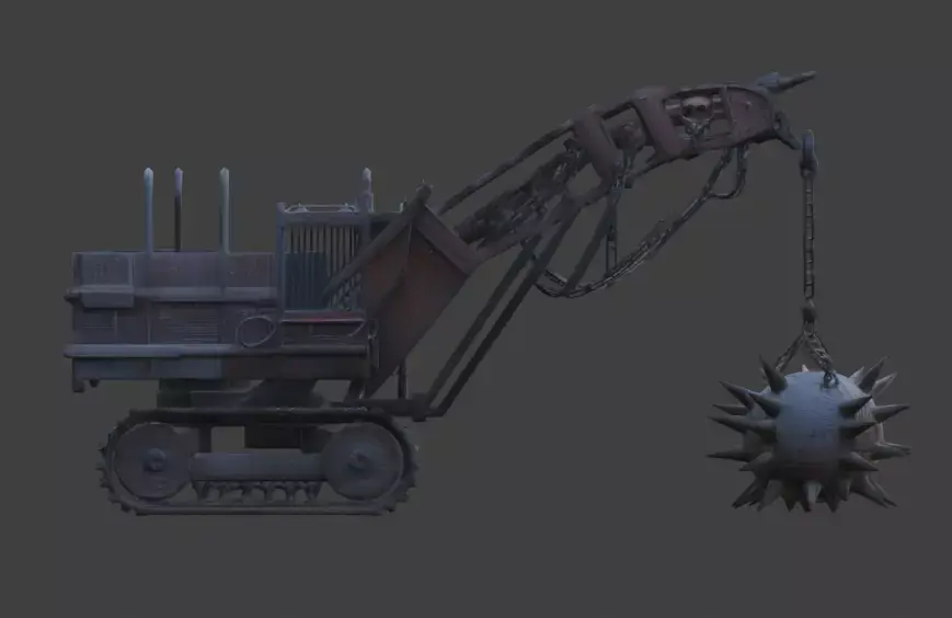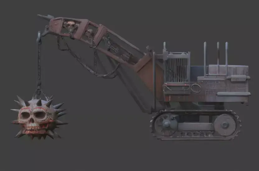 Tagswrecking machine, demolition crane, 3d model, game asset, horror industrial, skull wrecking ball, gothic machinery, heavy equipment, weathered metal, rusted, dark fantasy, cinematic prop, 3d prop, apocalyptic vehicle, survival horror, spiked ball, realistic machine, industrial decay, mechanical prop, high poly detail