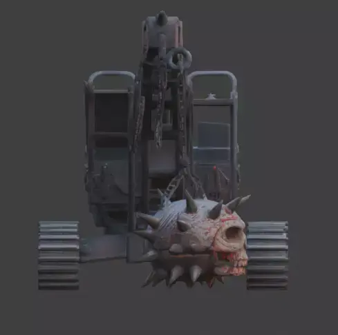 Inject a sense of overwhelming dread into your industrial or apocalyptic environments with this high-quality 3D model of a gothic demolition wrecking machine. This specialized heavy asset features a massive tracked chassis finished in dark, weathered steel with hyper-realistic oxidation, grime, and oil stains. The standout feature is the predatory demolition assembly, which includes a spiked wrecking ball intricately sculpted into a realistic, menacing skull and suspended by heavy-duty rusted chains.