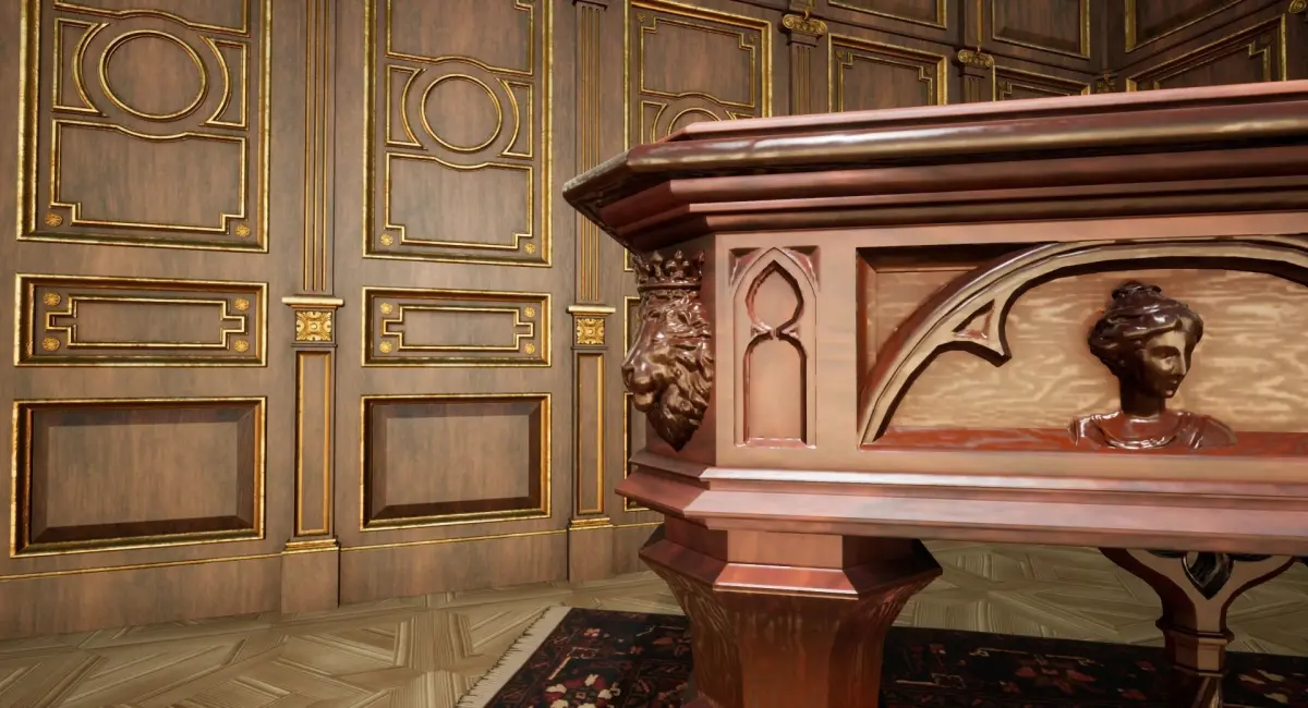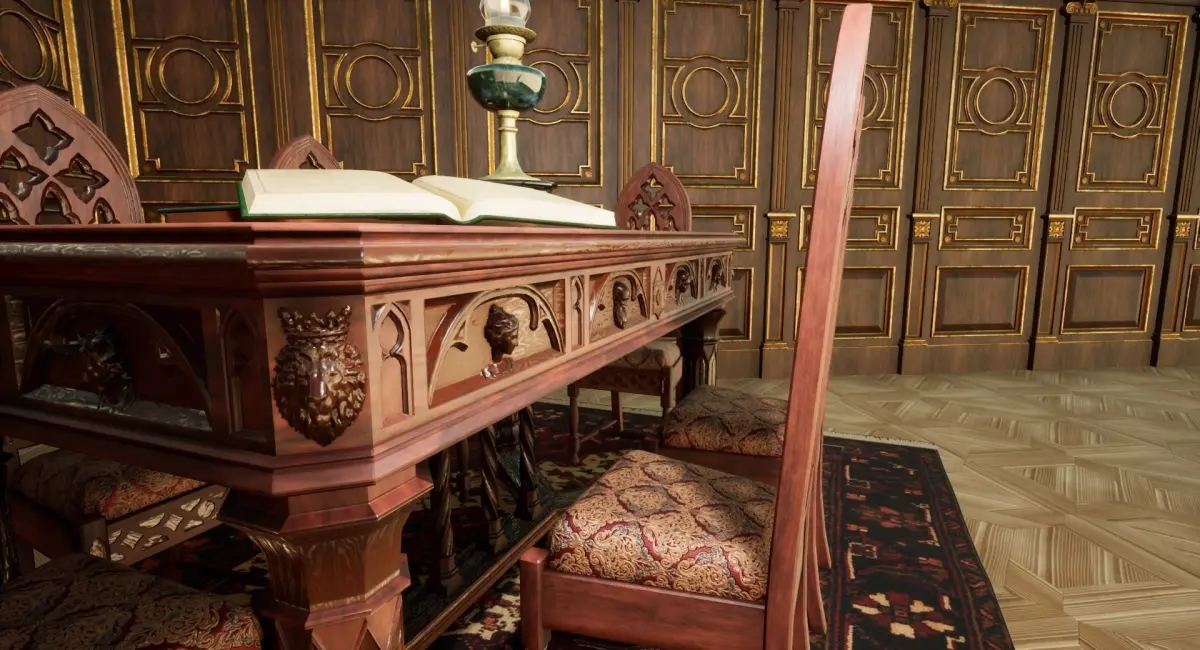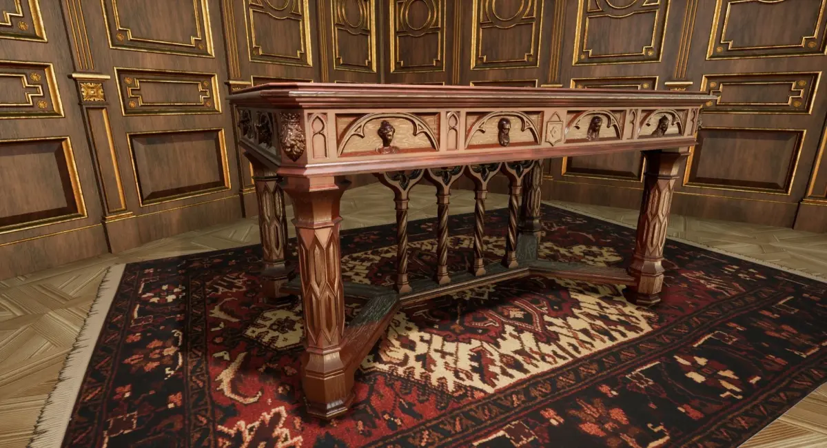Gothic dining furniture set scene includes gothic table with embossed heads, a chair with ornaments, an oil lamp, carpet, wall panels and a seamless textures of bricks and wooden floor. Models also have LODs and custom coliders for easy use as game props. Whole scene is designed for using in the late 19th century or early 20th century. Unreal engine 4 project is also included.
