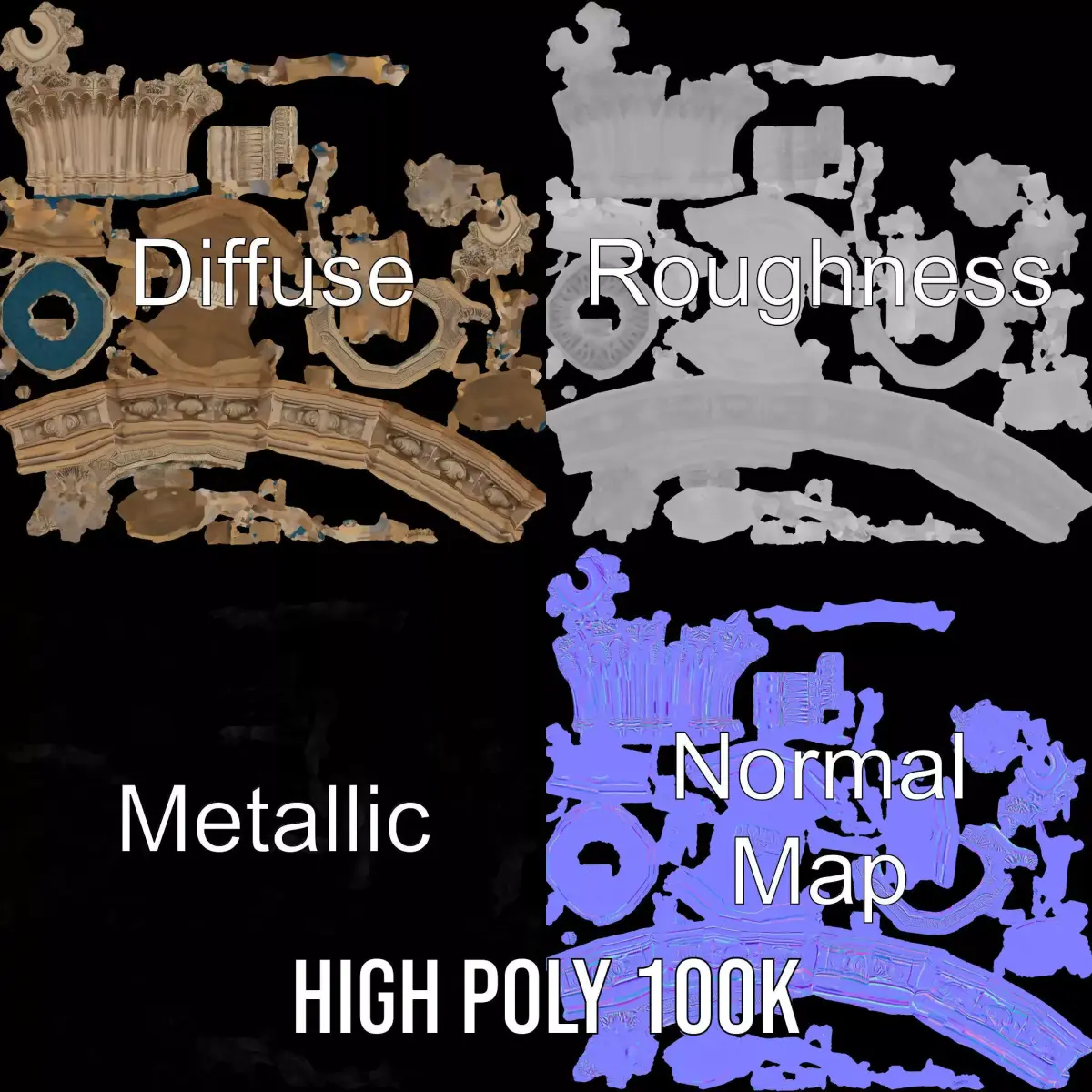 This Gothic Dragon Fountain model pack showcases an ornate, medieval-style fountain featuring intricate dragon sculptures. Perfect for historical, fantasy, or architectural visualizations, the fountain adds a touch of mystique and elegance to any scene. Each model has 3 levels of detail: low-poly (1000 triangles for mobile), middle-poly (10,000 triangles for environment), and high-poly (100,000 triangles), which allows for the use of this model in production rendering (such as 3ds Max, Maya, Cinema4D, Blender, Vray/Corona/Cycles and all others), game engines (Unity and Unreal compatible), and interactive presentations, providing a choice of detail based on the LOD System principle. The model's textures are PBR, Diffuse, NormalMap, and reflection/roughness/metallic, which are suitable for any modern rendering engine. All models are accurately unwrapped and have no overlapping UV. All textures are 4096*4096 in size. If you like this model, please leave a comment and a like!