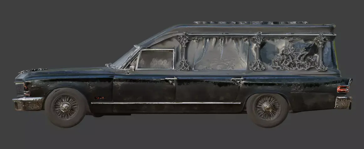 DescriptionThis high-quality 3D model features a chilling and highly detailed gothic hearse, designed with a dark horror aesthetic. Inspired by classic coffin designs, the vehicle showcases an elongated, weathered black body with intricate silver filigree and ornate skeletal carvings along the roof and side panels. The realistic textures include grime, rust, and tattered interior curtains, making it an ideal centerpiece for horror-themed games, cinematic renders, or spooky environment builds.