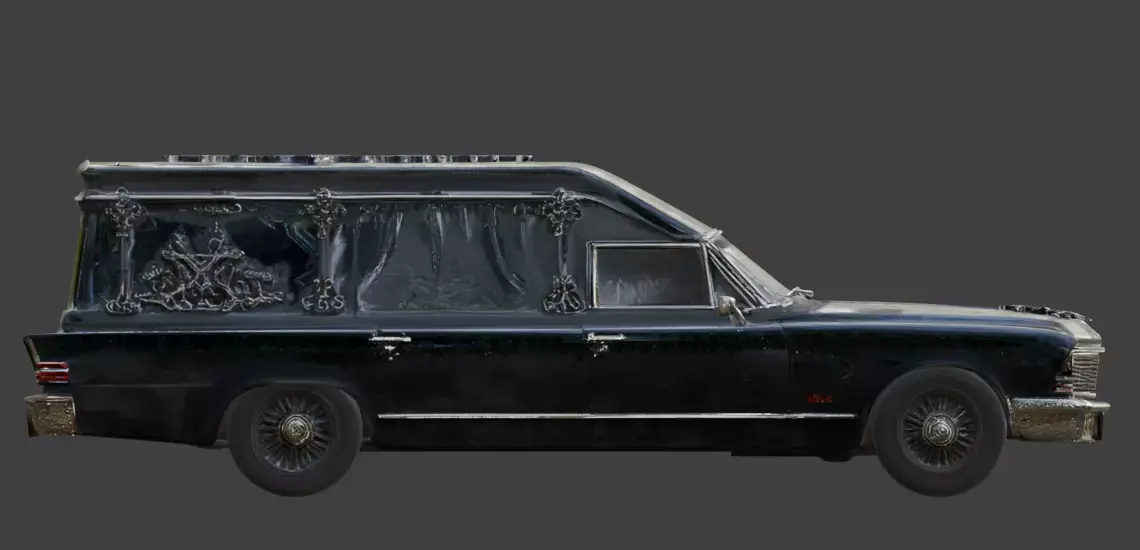 The model captures a professional level of macabre detail, from the vintage chrome bumpers and quad-headlights to the specialized elongated rear compartment. Every element is meticulously crafted to ensure a polished yet haunting appearance, optimized for high-fidelity digital scenes. Provided on an isolated white background, this hearse is ready to bring a sense of dread and dark elegance to your creative projects.