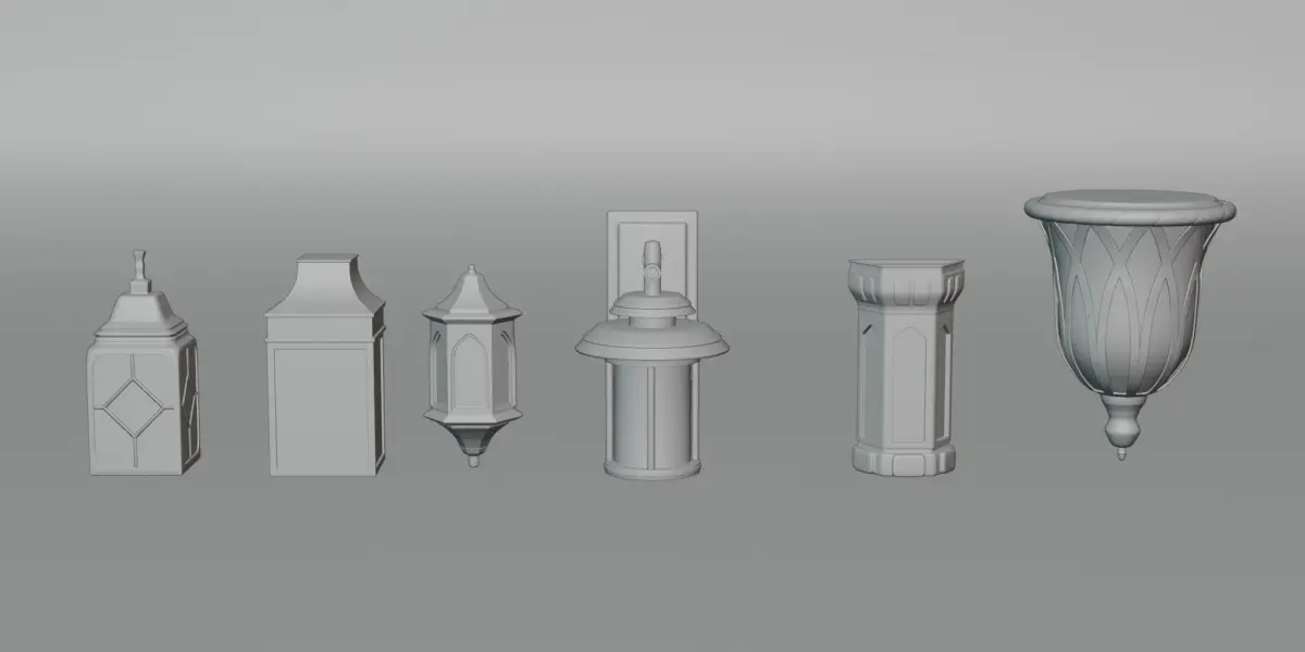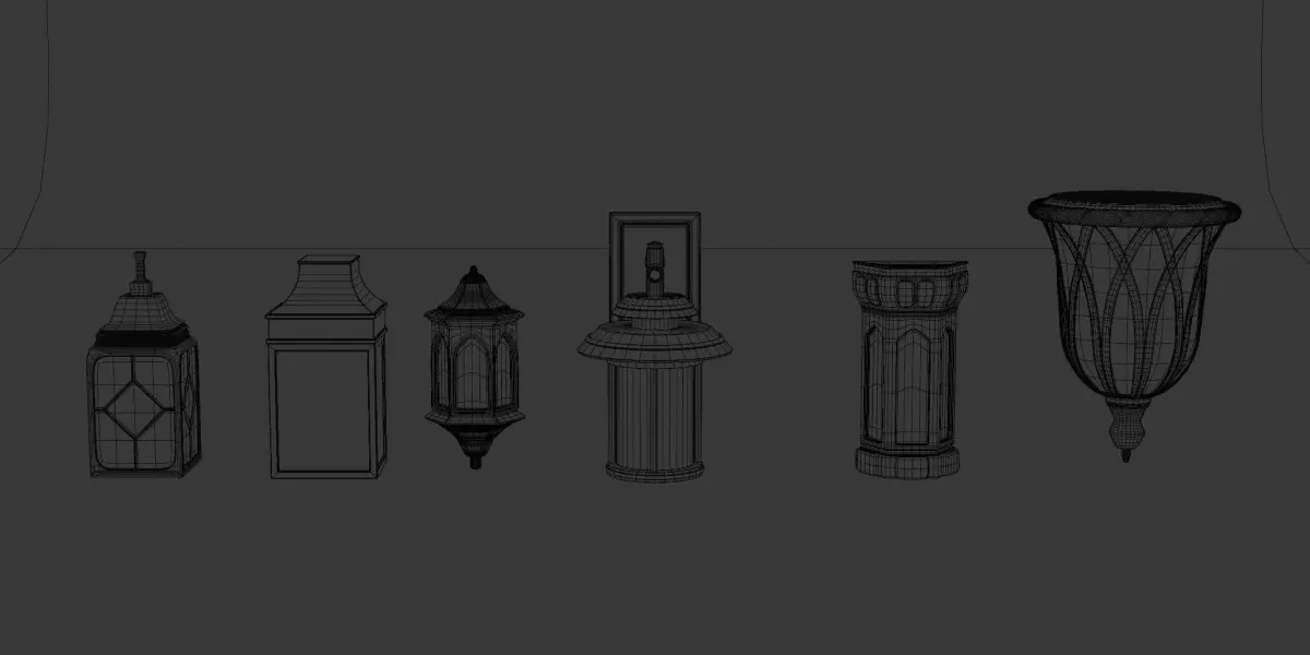 A set of six lamps that can be used as wall lamps made very close to the gothic style.(.fbx and .obj + .blend)Ready for applying subdivisions.Easily adjusted models, let your creativity soar..