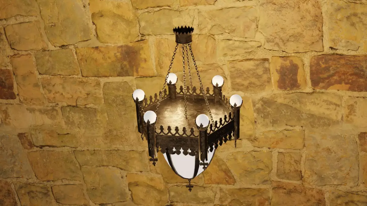 Hanging Chain Assembly: Realistic suspension chains and a ceiling crown make this model ready to drop into any vaulted space or stone-walled interior.