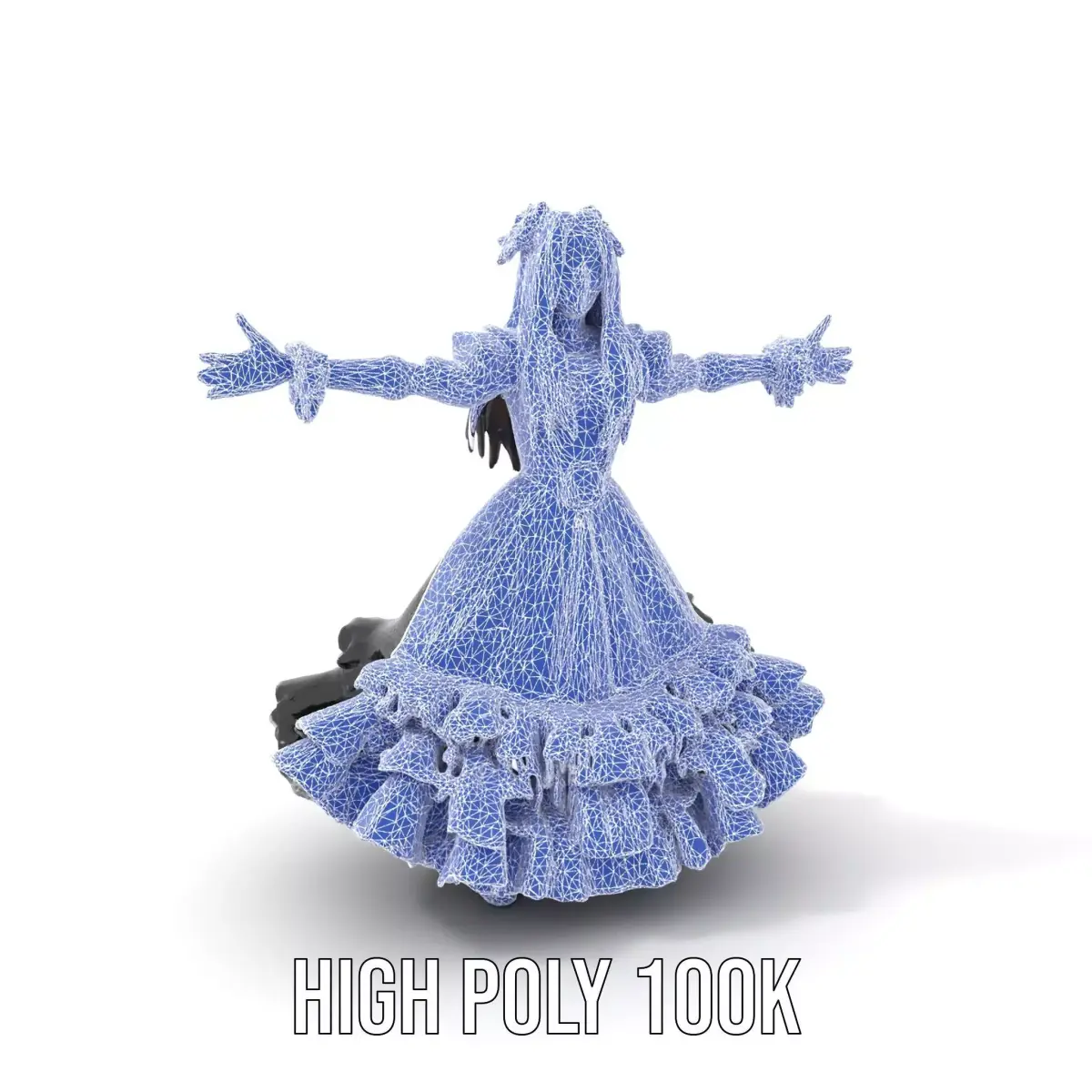 This Gothic Lolita Dress model emphasizes the delicate and intricate design of period costumes, perfect for Victorian-themed projects, fantasy scenes, and virtual fashion showcases. Each model has 3 levels of detail: low-poly (1000 triangles for mobile), middle-poly (10,000 triangles for environment), and high-poly (100,000 triangles), allowing for use in production rendering with 3ds Max, Maya, Cinema 4D, Blender, and more. It is also Unity and Unreal compatible, ideal for game development and interactive presentations. The model features PBR textures with Diffuse, NormalMap, and reflection/roughness/metallic maps for realistic rendering. All models are accurately unwrapped without overlapping UVs. The textures are 4096x4096 in size and ensure stunning detail quality. If you like this model, please leave a like and comment!