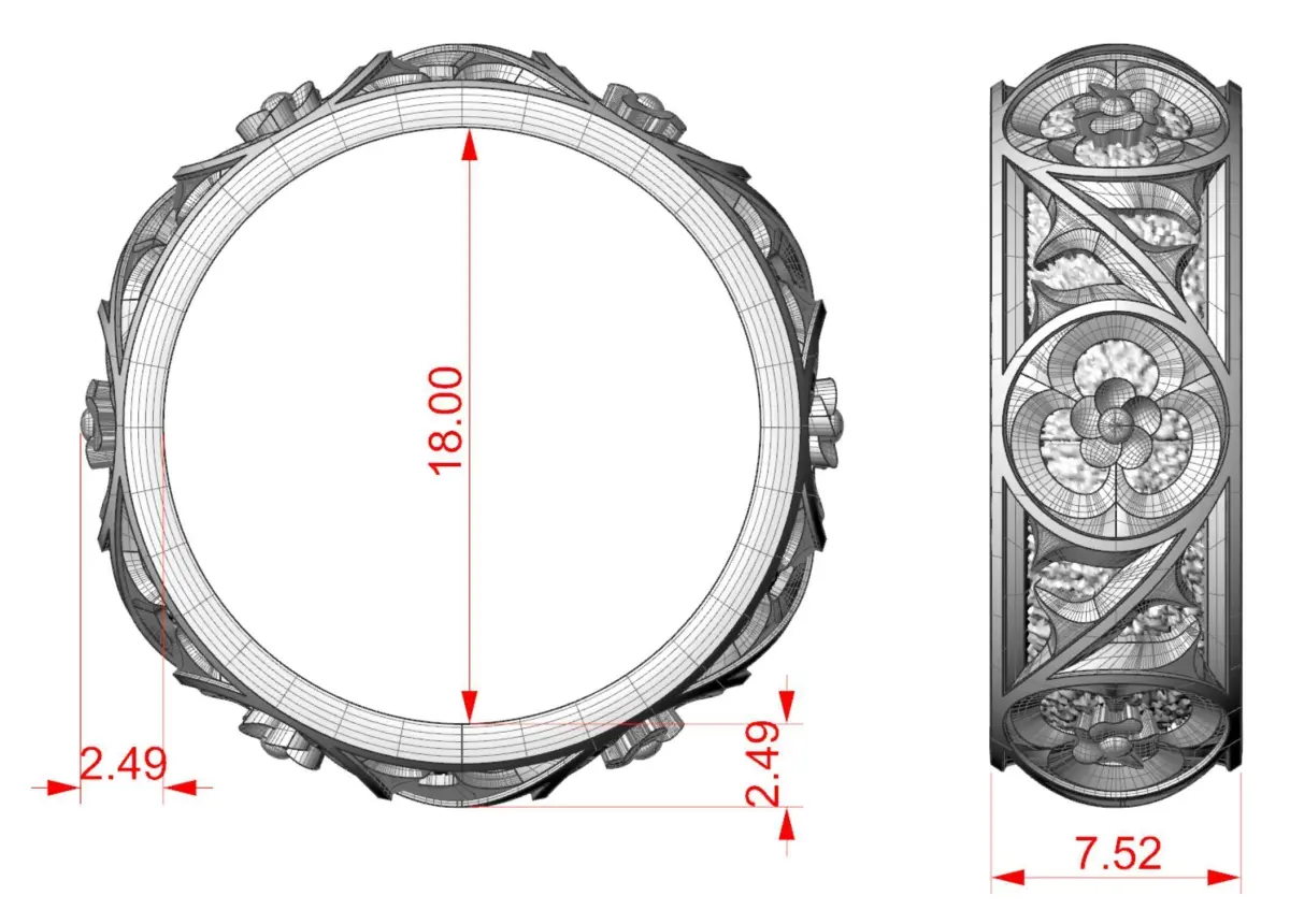 Ring sizes: inner diameter – 18 mm, Recommended material - silver or gold! Approximate metal weight (for ring size 18 mm) gold 14k – 9.59 grams; gold 18k – 11.48 grams; silver 925 Sterling – 7.72 grams. Model volume (for ring size 18 mm) - 744,719 cubic mm.