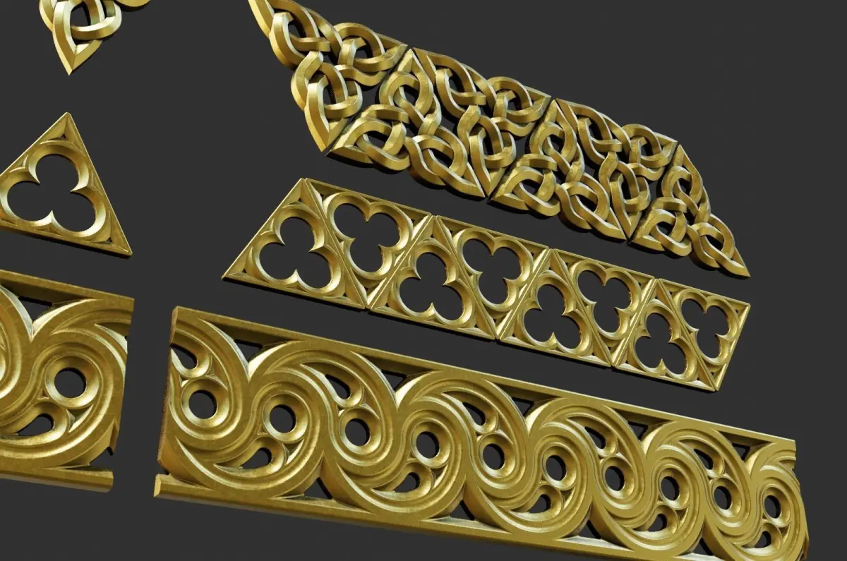 The software environment blender3.1, closed solid model, three sets of styles, the poly amount of each model is shown in the screenshot, UV has been displayed, gold material, no texture.The three sets of modeling output the common formats of obj and stl respectively. Pattern 1 has an adjustable width modifier, and the output type is collapsed according to the default width. If you need to adjust it, you need to adjust it in blender. You can get more information from the preview pic.If any question please write to me.