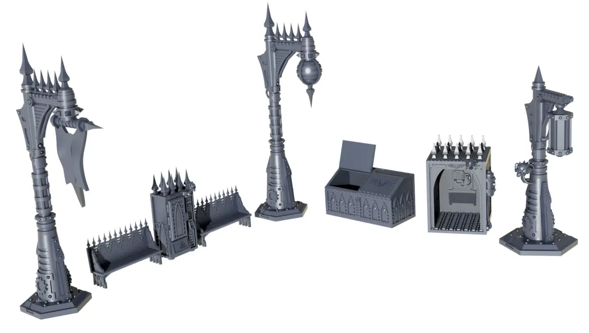 A series of scatter terrain pieces for a gothic sci fi city scape, the pack includes street lights, vending machines, dumpsters, benches and telephone boxes.