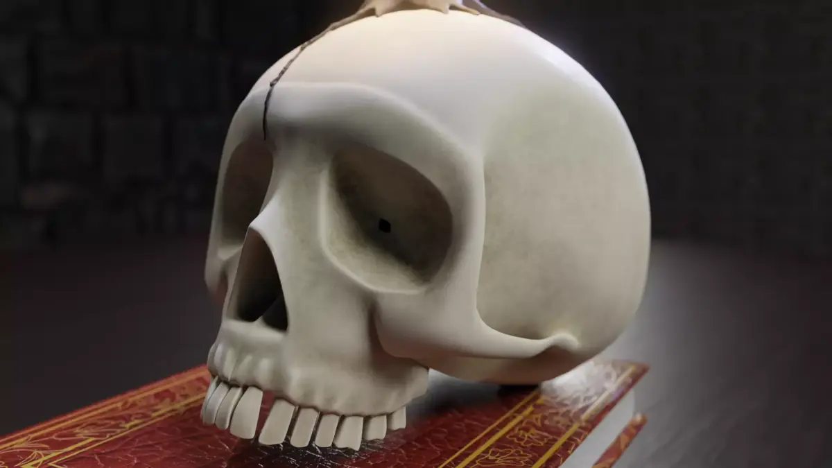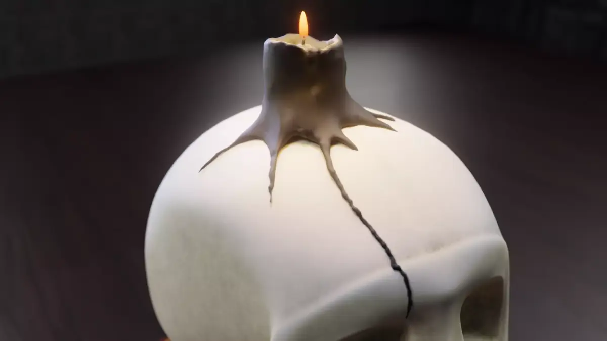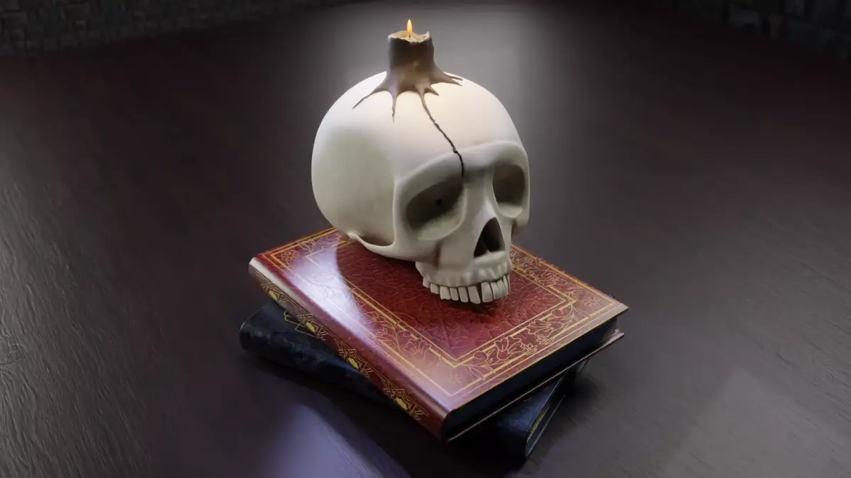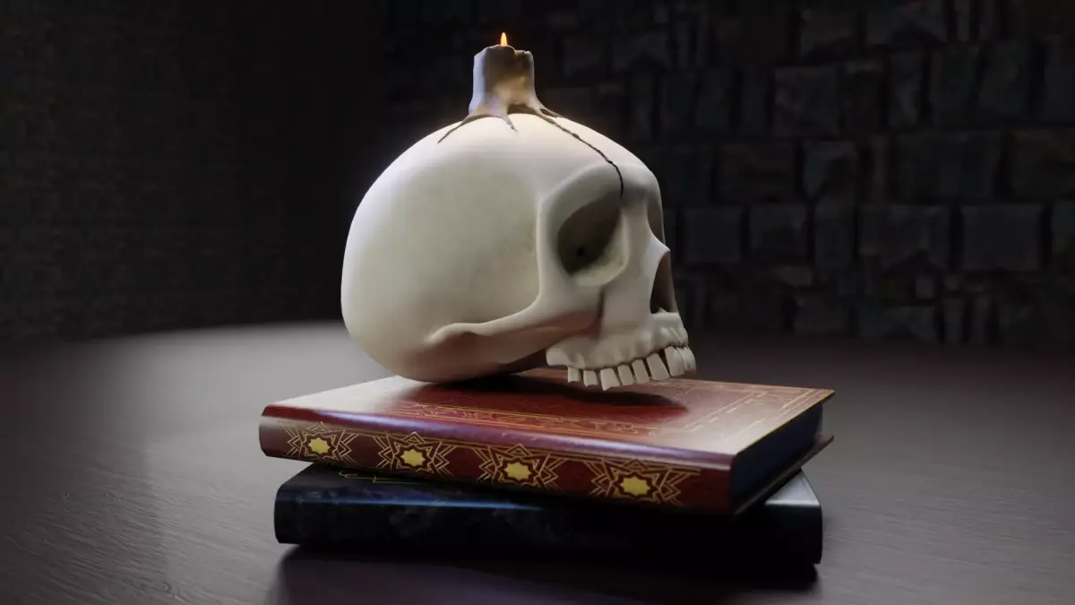 A dark, atmospheric 3D scene featuring a stylized human skull serving as the base for a melting black candle.The candle has thick, stylized wax drips that cascade down the skull, following its contours to create a dramatic, realistic melt effect.The setup rests on a stack of two ancient books- one a deep burgundy red with subtle golden accents, the other a simple matte black.