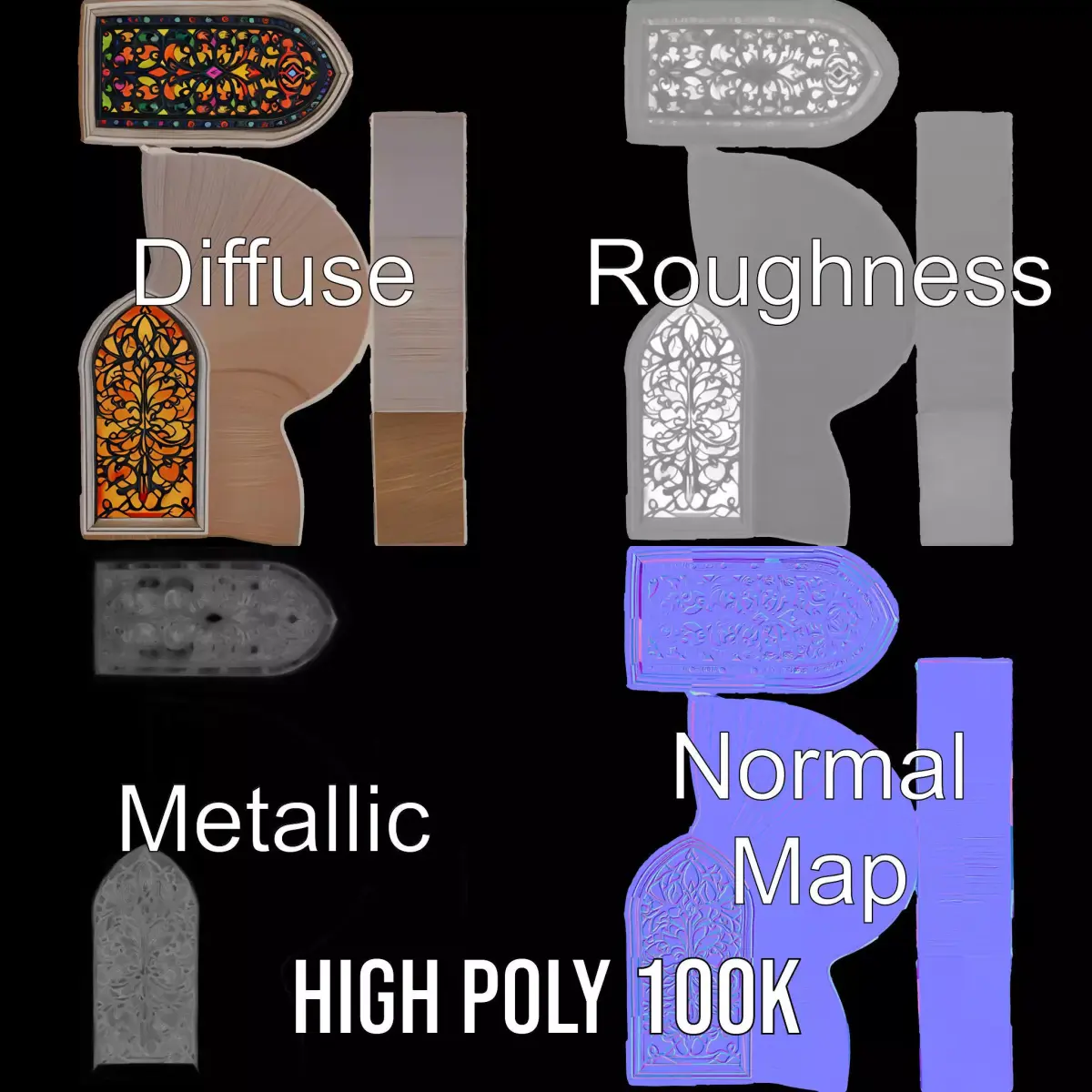 Each model has 3 levels of detail: low-poly (1000 triangles for mobile), middle-poly (10,000 triangles for environment), and high-poly (100,000 triangles), which allows for the use of this model in production rendering (such as 3ds Max, Maya, Cinema 4D, Blender, Vray/Corona/Cycles and all others), game engines (Unity and Unreal compatible), and interactive presentations, providing a choice of detail based on the LOD System principle.