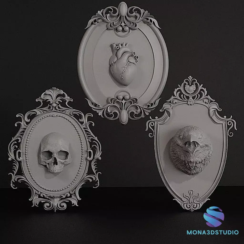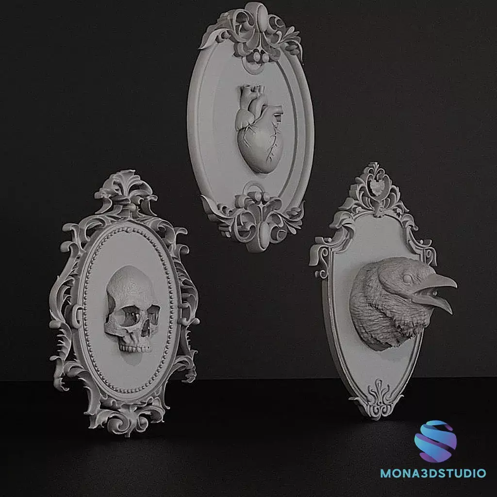 This 3D printable gothic décor set includes 3 ornate picture frames featuring a skull, an anatomical heart, and a raven head. Each model is full figure, split for easy printing, and stands about 20 cm tall. Perfect for gothic interiors, Halloween decorations, or spooky wall art. Print in resin or FDM and paint for stunning results.