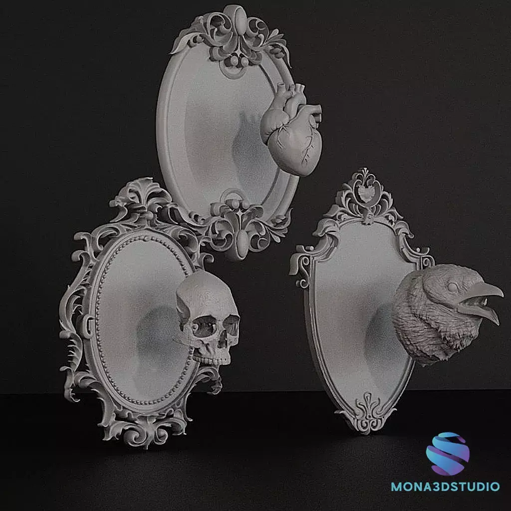 This 3D printable gothic décor set includes 3 ornate picture frames featuring a skull, an anatomical heart, and a raven head. Each model is full figure, split for easy printing, and stands about 20 cm tall. Perfect for gothic interiors, Halloween decorations, or spooky wall art. Print in resin or FDM and paint for stunning results.