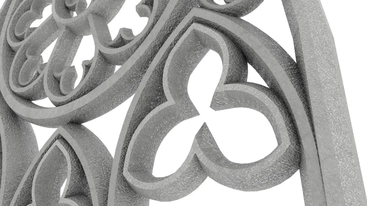 This 3D model represents a beautifully detailed Gothic window tracery, designed for architectural visualization and historical recreations. The model features intricate patterns characteristic of Gothic architecture, including a prominent circular motif at the top and three vertical sections with trefoil designs below.