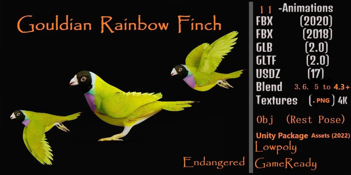 The Gouldian finch, also known as the Gould's finch or the rainbow finch, is a colourful passerine bird that is native to Australia. .3D Gouldian finch Bird Animal Model By Nyilonelycompany.