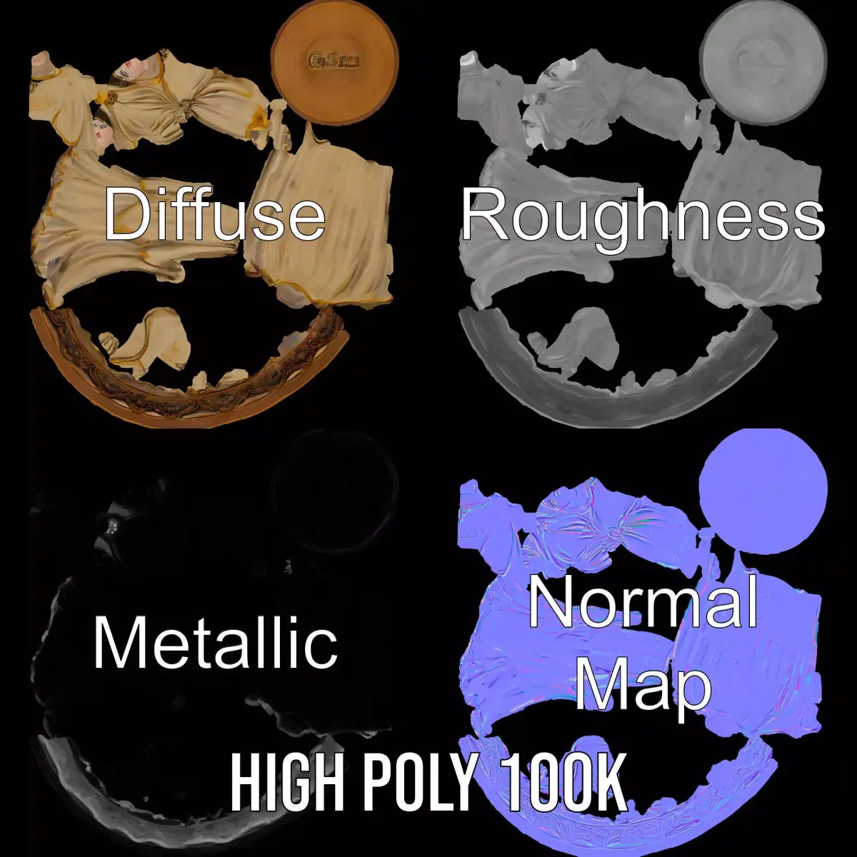 This elegant figurine sculpture captures a serene presence, adorned in detailed drapery with a finely crafted base. Each model has 3 levels of detail: low-poly (1000 triangles for mobile), middle-poly (10,000 triangles for environment), and high-poly (100,000 triangles), which allows for the use of this model in production rendering (such as 3ds Max, Maya, Cinema4D, Blender, Vray/Corona/Cycles and all other), game engines (Unity and Unreal compatible), and interactive presentations, providing a choice of detail based on the LOD System principle. Perfect for use in architectural visualizations, religious scenes, or as a collectible item in virtual spaces. The model's textures are PBR, Diffuse, NormalMap, and reflection/roughness/metallic, which are suitable for any modern rendering engine. All models accurately unwrapped and have no overlapping UV. All textures are 4096x4096 in size. If you enjoy the model, please like and leave a comment!