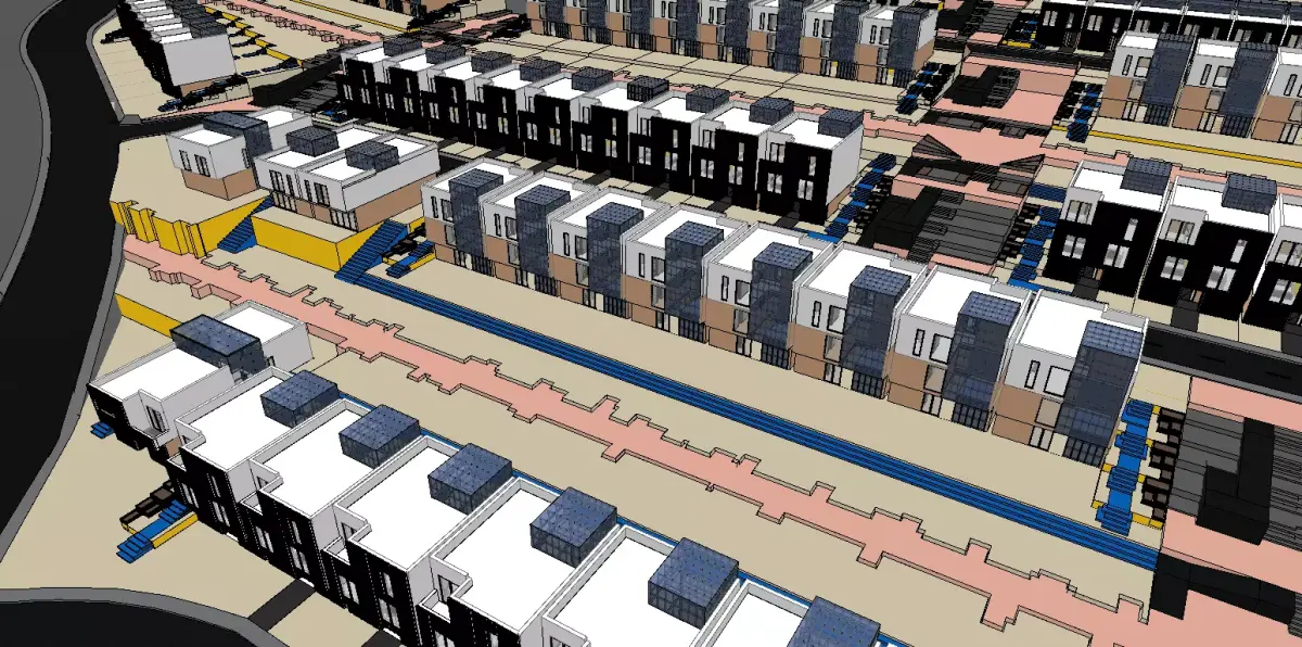The architectural composition is based on simple and functional forms, optimized solar orientation, and the use of passive design strategies for energy conservation. Each housing unit is equipped with solar panels, advanced thermal insulation, and rainwater collection systems. Public areas include community gardens, pedestrian and bicycle paths, and social gathering zones, creating a green, peaceful, and cooperative environment.