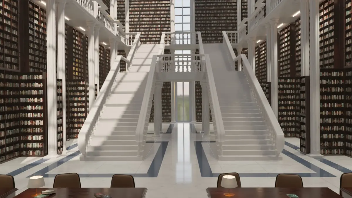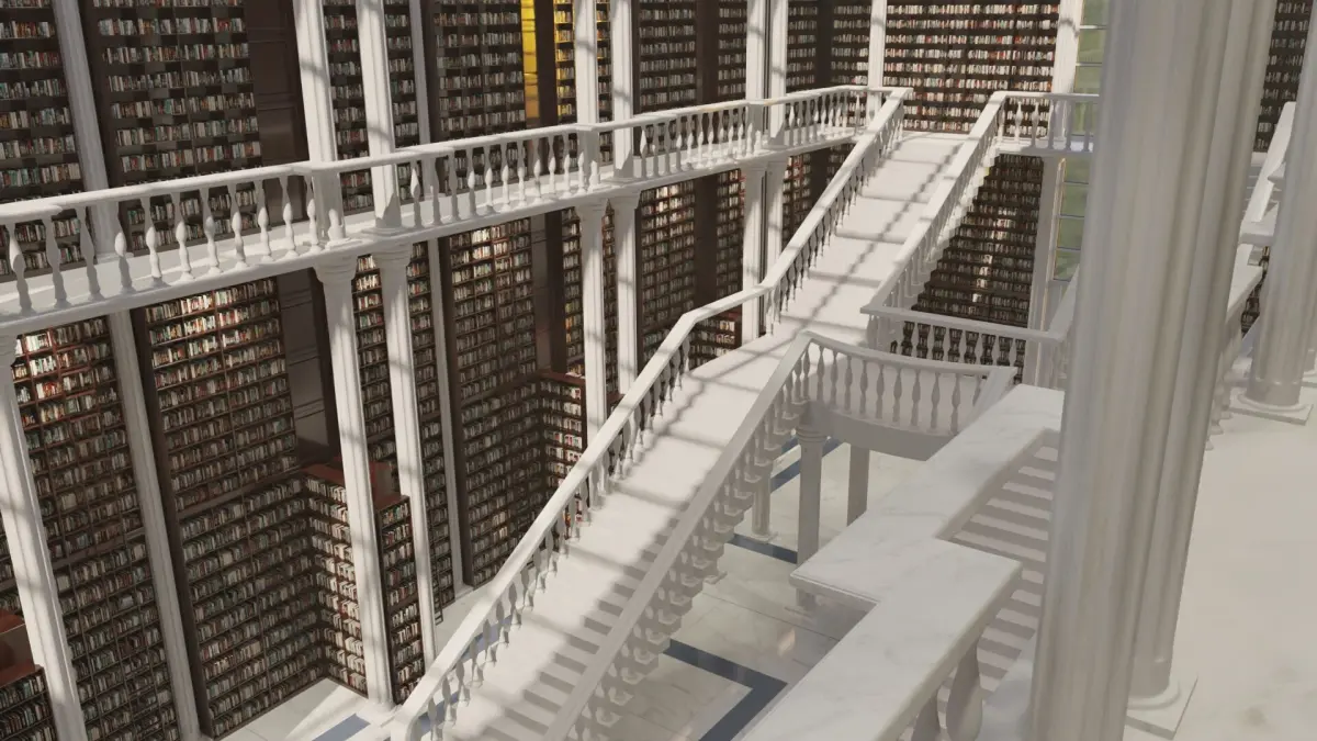 - Detailed Furnishings: Includes rows of classic wooden reading tables with lamps, inviting chairs, and additional bookshelves that line the lower levels, creating a rich and believable scene.