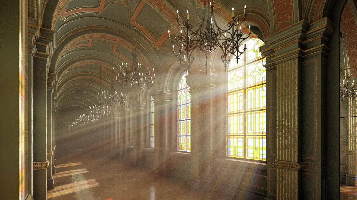 The model is fully textured with Hdri system. Hdri and cameras are included in the file. All objects have names and are organized with layers according to type of object. The model is composed of different objects: arch, door frame, luster, lamps, glass, etc. The model uses PBR materials, and procedural materials (silver, crystal) for the big chandelier.