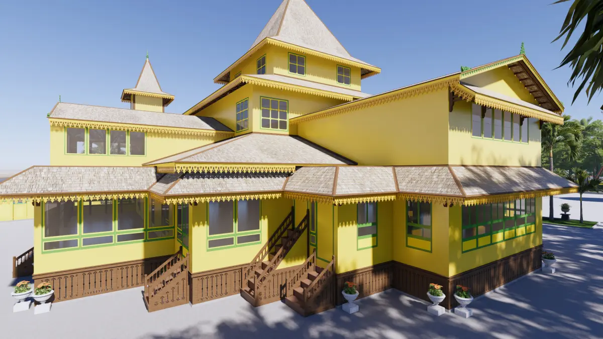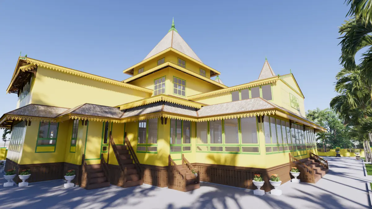 The Grand Mosque of Sultan Muhammad Tsyafiuddin II is one of the oldest mosques in West Kalimantan. It is located in the south of the palace courtyard facing the intersection of the Sambas River with access from the riverbank. This mosque was built on October 10, 1885 by Sultan Muhammad Tsyafiuddin II (the 13th Sultan) based on the vow of his mother, Ratu Sabar, to build a mosque. Although previously there was a place of worship in the form of a small mosque. Before this mosque was built, it was initially a small prayer room, the former home of Sultan Umar Aqamuddin I (the 3rd Sultan of Sambas), until finally it was built into the mosque that exists today. The mosque, which stands on a 60 x 40 meter plot of land, has a distinctive Malay architectural style. It was built with a stilt house model to avoid flooding, because the mosque is located facing a river. Architecturally, the Jami' Mosque of the Sambas Sultanate has a square plan consisting of 2 floors with a fairly large number of doors and windows. The 4-story roof with a rectangular peak space and a tapered crown on top, there are 2 towers on the left and right of the mihrab with the same roof shape. The materials used are almost 100% ironwood, including pillars, floors, walls, and roofs. The walls are painted yellow, the roof and fence under the building are brown. In 1975, renovations were carried out on the decayed pillars supporting the mosque and then wrapped in concrete. The Grand Mosque was designed using the Sketchup application and rendered using Enscape to produce a more realistic appearance. There are 6 layers of structural elements in the application so that it makes modeling easier and more detailed and neater. The textures and materials used are included in the SketchUp application. with that, everything shown in the preview image is included in the sketchup application which contains everything. This 3D model sketch can be converted into various applications such as fbx, obj, 3ds, blend, and others. This 3D model can be used for students, researchers, architects, civil construction, humanists and many others.For further questions, you can do this via the shop or Email : 3rd.summer.studio@gmail.com ; Whatsapp : +6289692630617 ; Instagram : 3rd_summerstudio