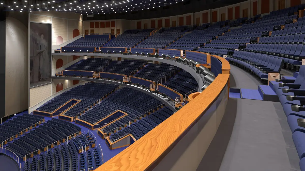 Interior of theater, that is a large auditorium designed for high-profile shows. Its layout includes tiered seating, refined lighting, and a deep stage area. The venue can be used for major concerts and resident performers.