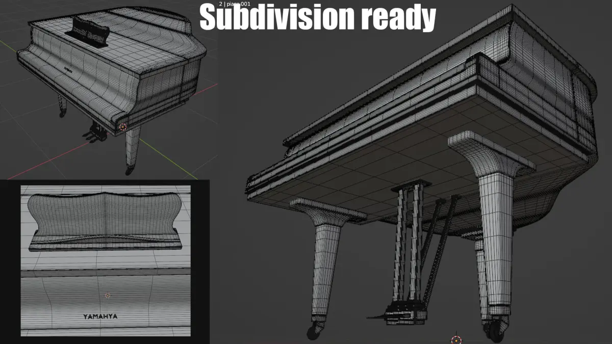 Piano I made , textured and rendered in Blender with cycle.It's subdivision ready, the .blend file already contains a subdivide modifier.Textures are packed in it.