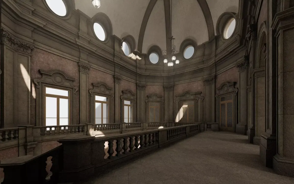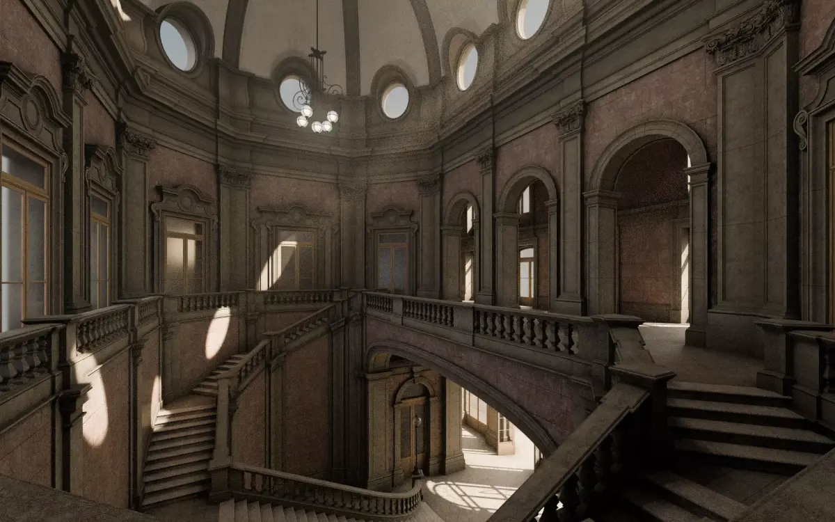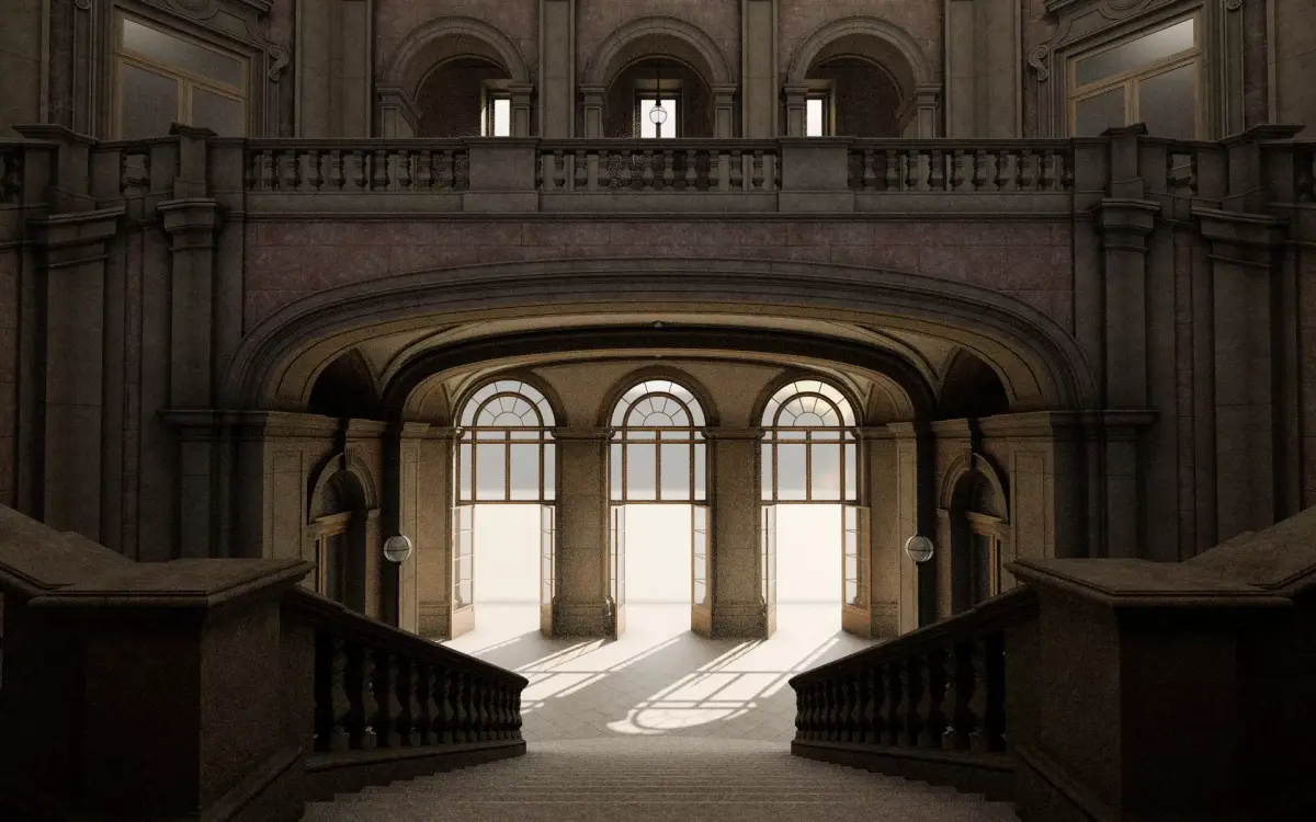 Detailed 3D model of a classical staircase. Suitable for high resolution close-ups. Real world scale. Cameras are placed at eye level (~1.66m / ~5'5''). Scale figurines are 1.80m (5'11'') in height.