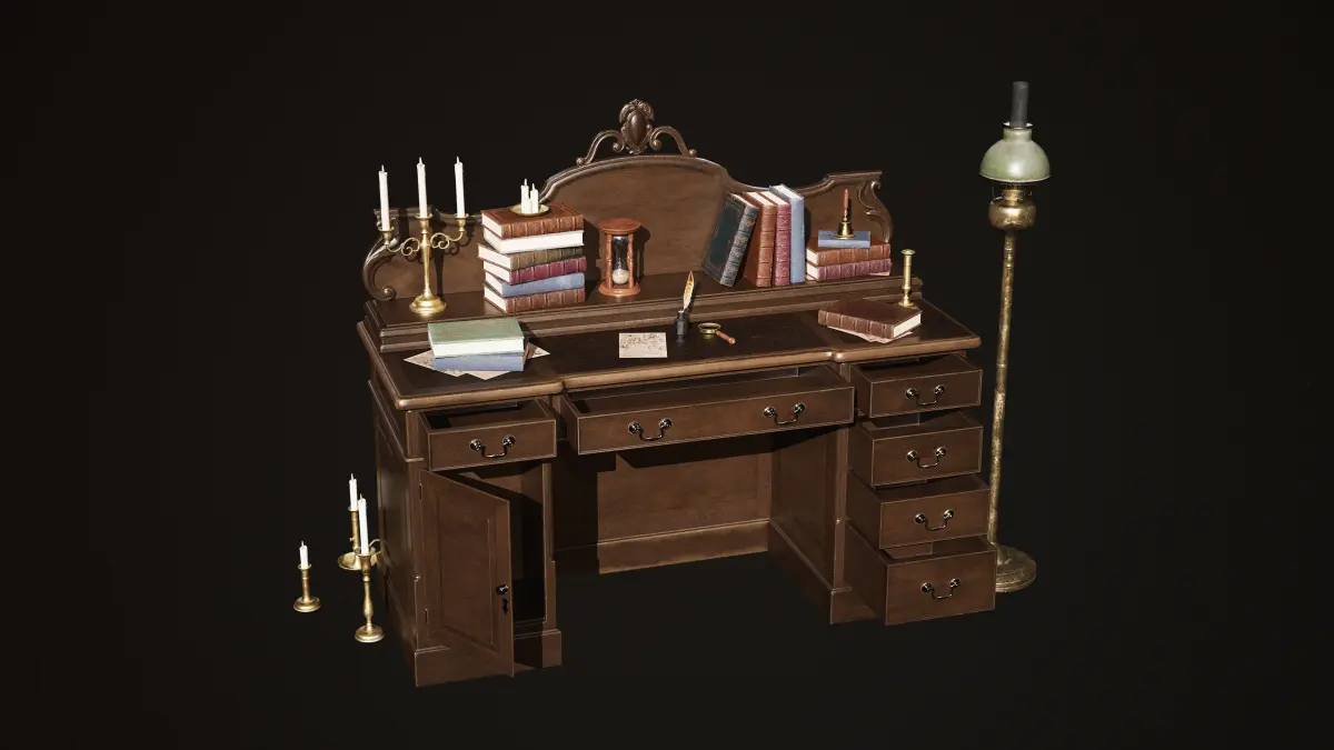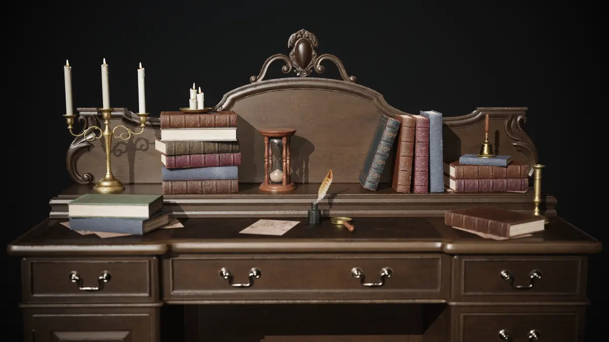 - More than 20 unique assets: includes the desk, books, candle holders, lamp, magnifying glass, hourglass, and bell