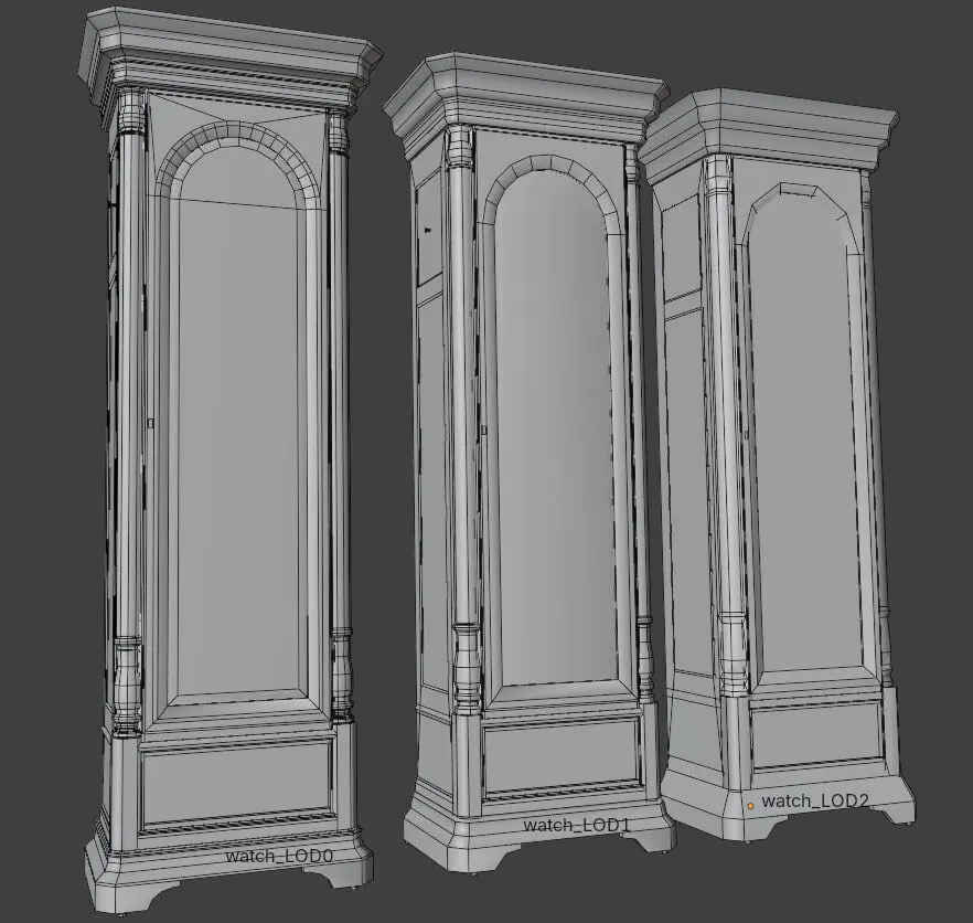 Old grandfather clocks game-ready model with movable pendulum and hands and LODsMade in about 20 hoursLOD0 ~ 3k trisLOD1 ~ 1.5k trisLOD2 ~ 750 tris