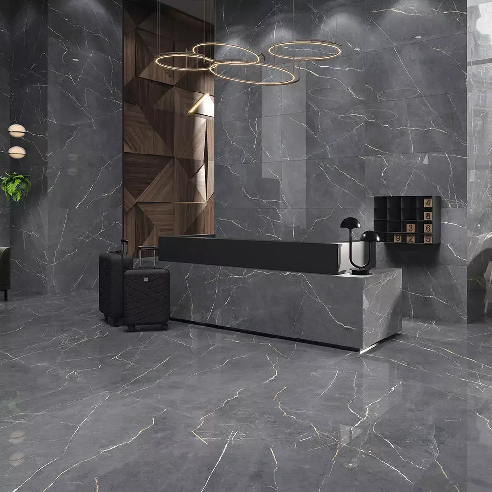 Luxury hotel lobbies, reception desks, bathrooms, kitchens, and living spaces needing dramatic dark marble surfaces.