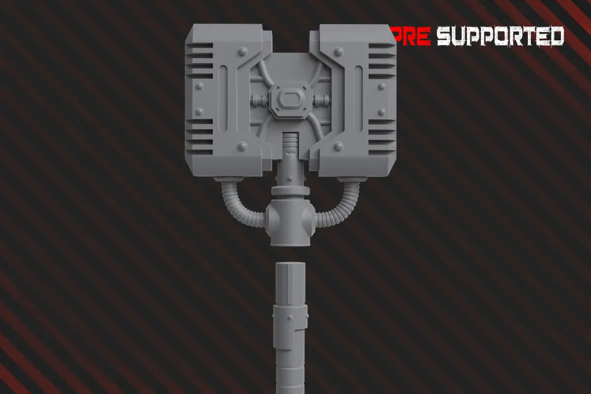This is a highly detailed 3D printable Grav Crusher Hammer designed for sci-fi or futuristic-themed props, cosplay accessories, tabletop games, or collectible displays. The model features industrial-style mechanical engravings, segmented energy coils, and reinforced plating, ideal for 3D printing with both resin and FDM printers.
