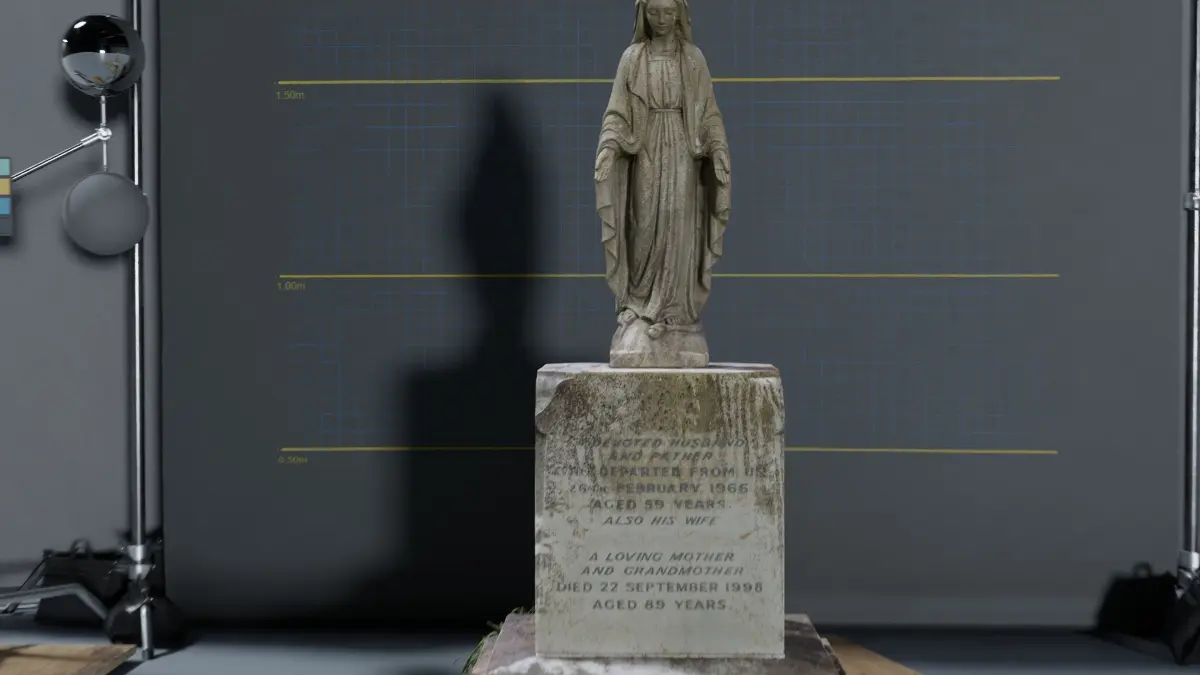 The first diffuse map texture is the original photography with the lighting baked in and profiled to sRGB so is considered the 'ground truth'. The second map is called diffuse_3 and is delit and has the names on the gravestone removed for re-lighting. Note the model and normal maps have the Gravestone names removed.