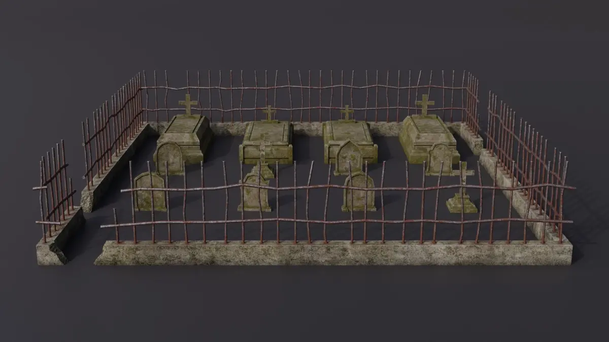 2 packs of 4K PBR Textures (16 bits PNG and TIFF)1 - Base color, Roughness, Normal and Metalic (apply to the fences)2 - Base color, roughness and normal (apply to the tombs and tombstones)